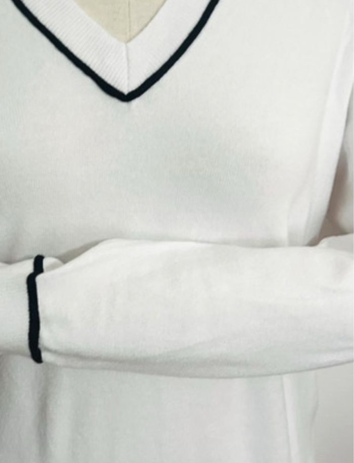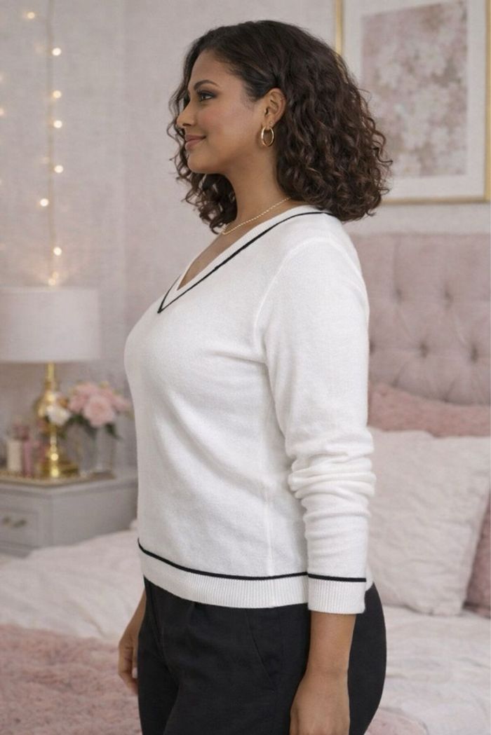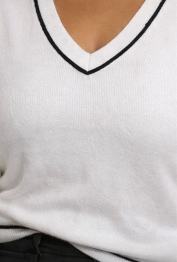 Un modèle chic et intemporel avec son col V et son fin contour noir ultra élégant — un détail minimaliste mais très raffiné qui donne tout son charme à la pièce.