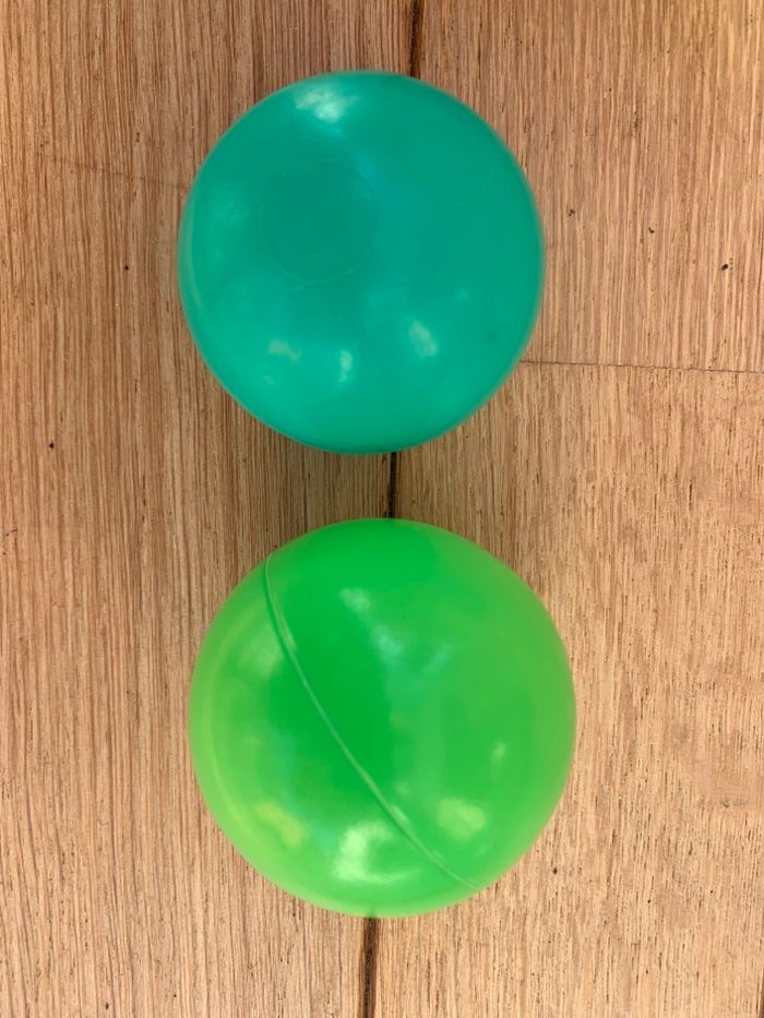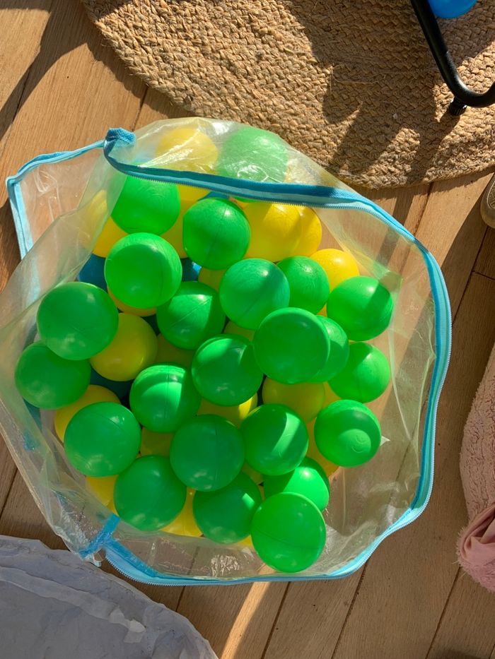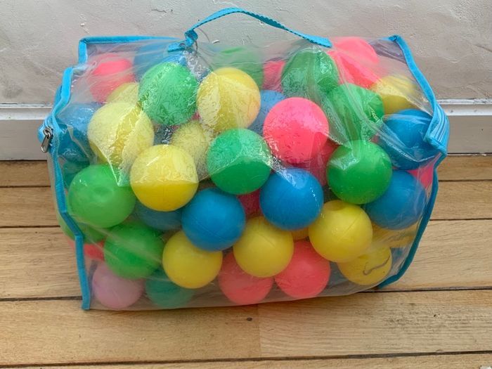 Lot de balles pour piscine à balles État = voir photos +\- 95 balles pour piscine à balles => 4 couleurs =>2 formats (voir dernière photo) - Bleu : 18 grandes et 2 petites - Jaune : 24 grandes et 2 petites - Vert : 23 grandes et 2 petites - Rose : 23 grandes et 2 petites Elles sont molles et se creusent par endroit/moment. On sait les remettre en place mais ça ne dure pas. Je ne sais pas si c’est normal ou non.