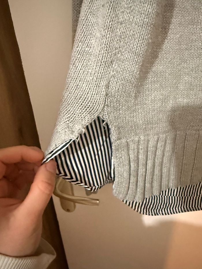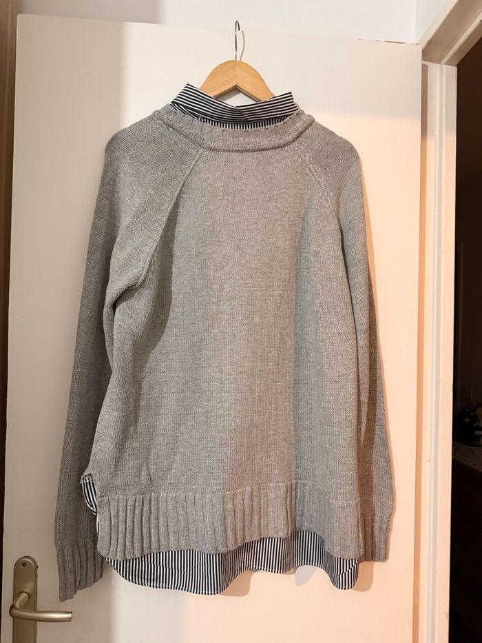 Modèle élégant avec effet superposé : pull gris en maille avec effet chemise intégrée rayée bleu marine et blanc (col et bas visibles).
