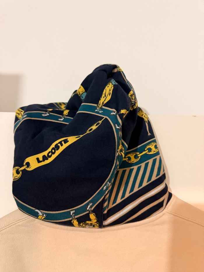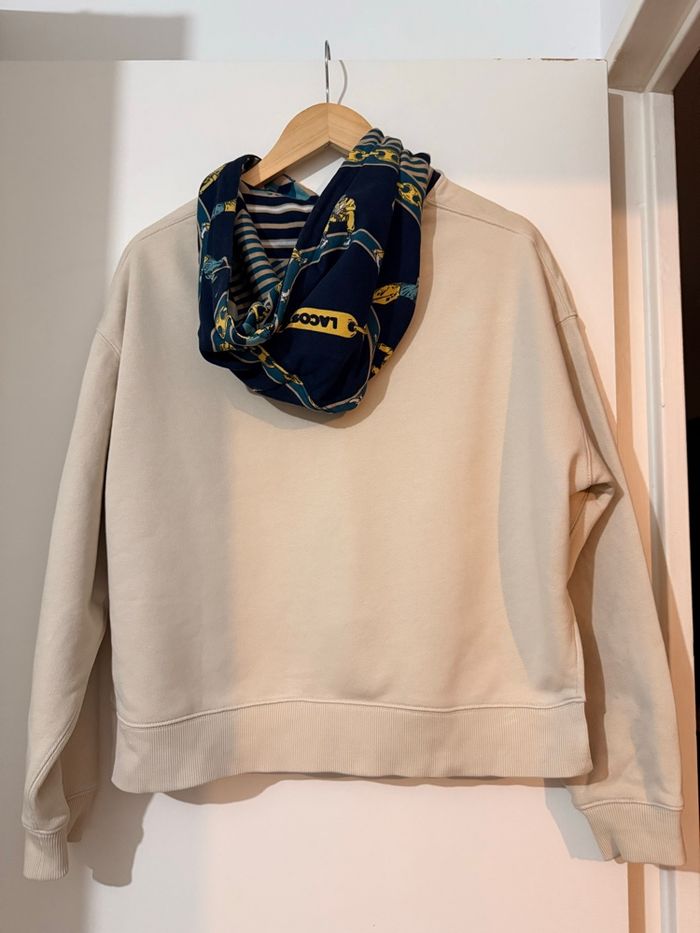 Je vends un pull/sweat Lacoste de couleur beige clair, au style élégant et original.