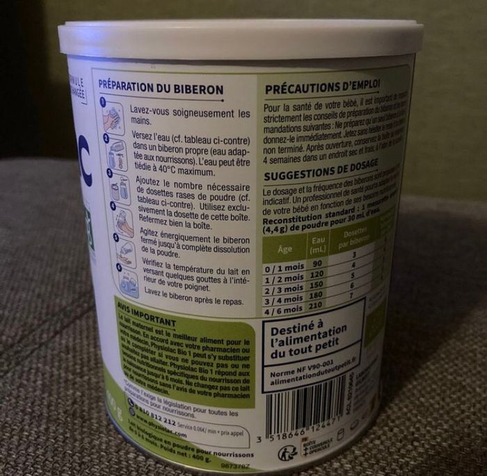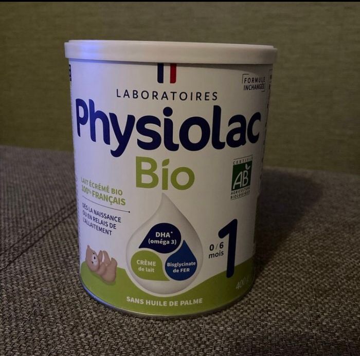 Physiolac Bio 1 Lait écrémé Bio 100% français 0/6 mois. 400g DLC 25/04/2026