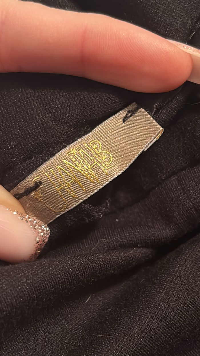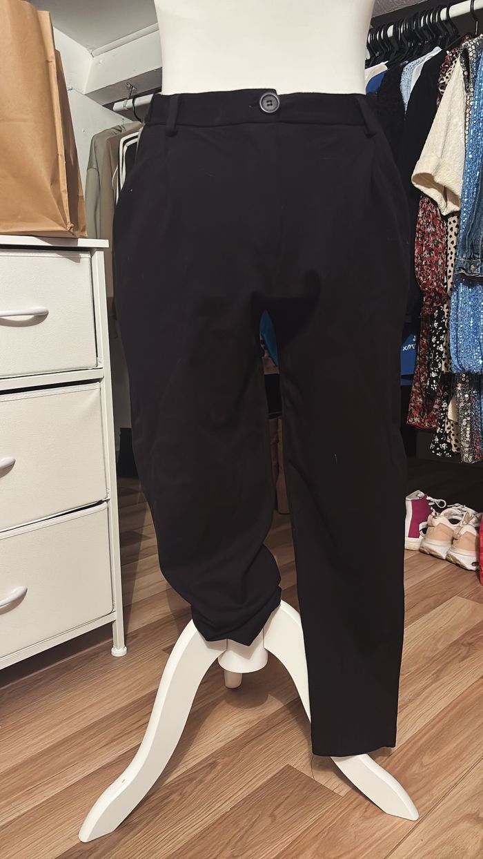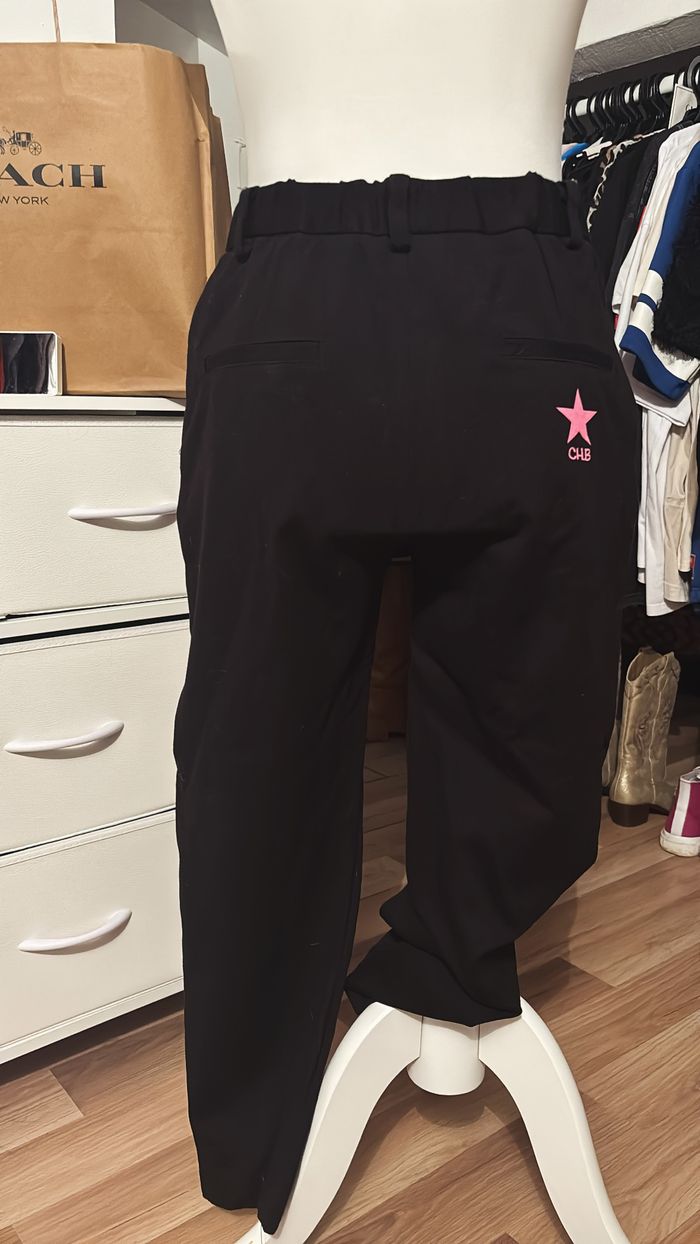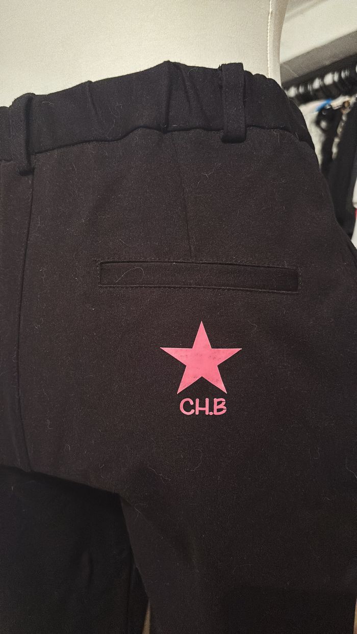 4€. 💙 Pantalon noir coupe droite 📏 Dimensions : longueur 79cm, largeur 34cm 📦 État : Bon état Matière : 100% polyester Pantalon noir coupe droite. Taille classique avec passants pour ceinture, fermeture bouton. Deux poches à l'arrière. Détail logo étoile rose avec inscription "CH.B" au dos.