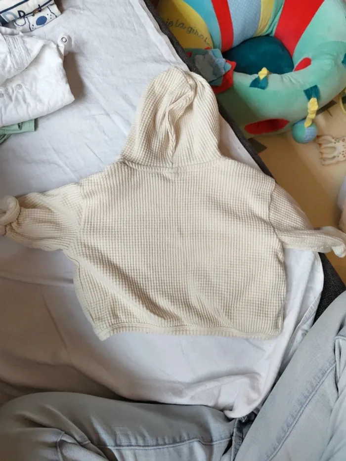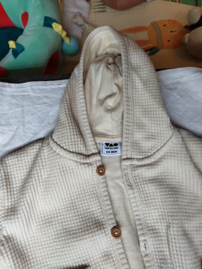 Gilet/veste TAO de demie saison très facile à enfiler sur bébé Capuche bebe l'a mis dès ses 3m. Étiquette 6m 68cm