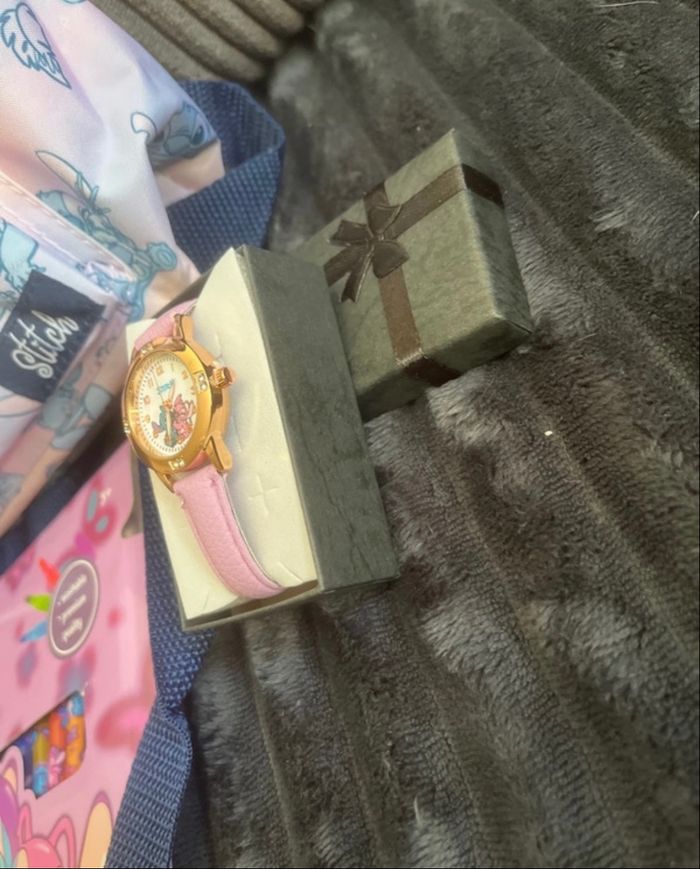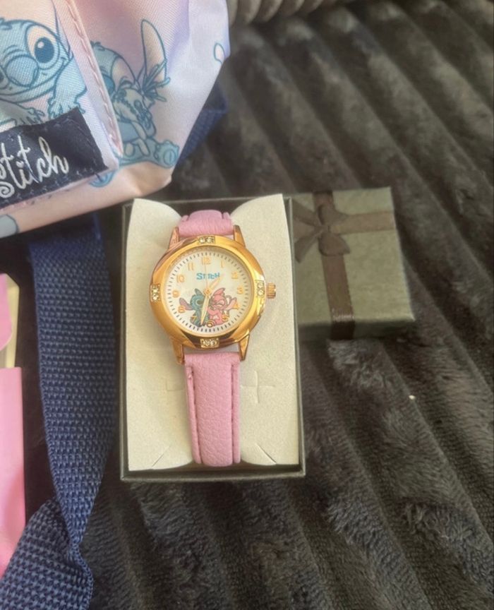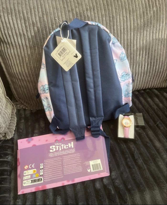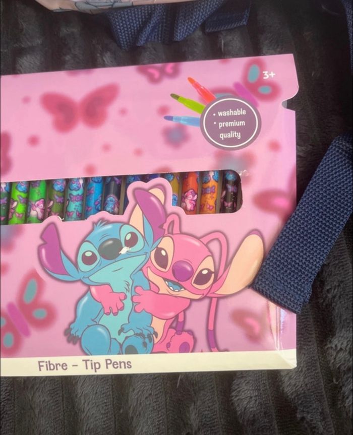 1montre stitch cuir Lila 1 paquet de 24 feutres stick Sac à dos Stitch Forme arrondie Bretelles ajustables Poignée sur le dessus Fermeture zippée sur le dessus 1 compartiment principal 1 poche zippée à l'avant 31 x 22 x 2 cm Sous blister Envoi rapide 📦