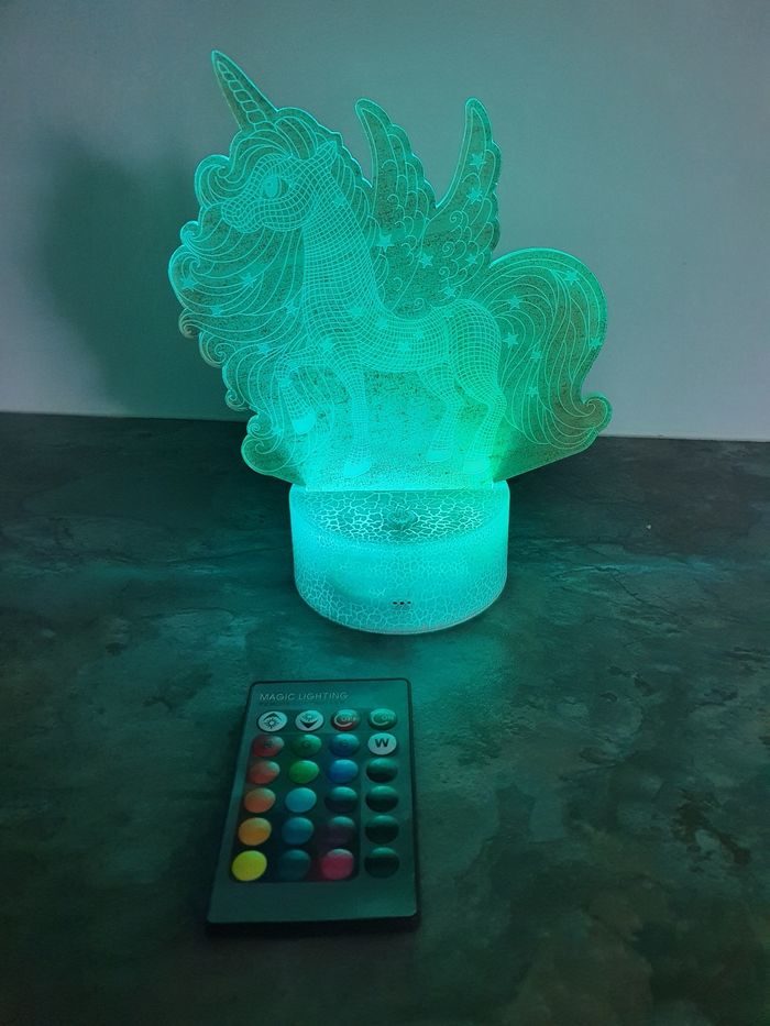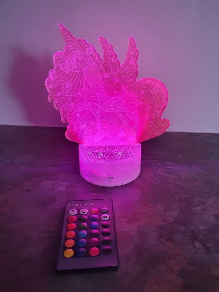 A vendre veilleuse licorne, divers coloris possibles, à choisir avec la télécommande. Simple d'utilisation ! Fonctionne avec 3 piles AA, possibilité de la brancher sur secteur (câble non fourni). Neuve jamais utilisée (sauf pour la photo). N'hésitez pas à jeter un coup d'œil sur mon dressing. Une réduction dès 2 articles achetés !
