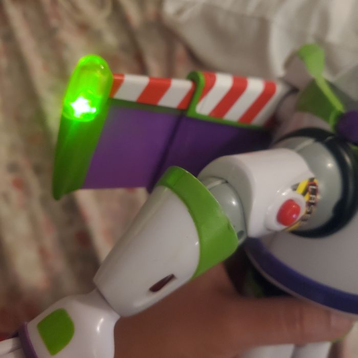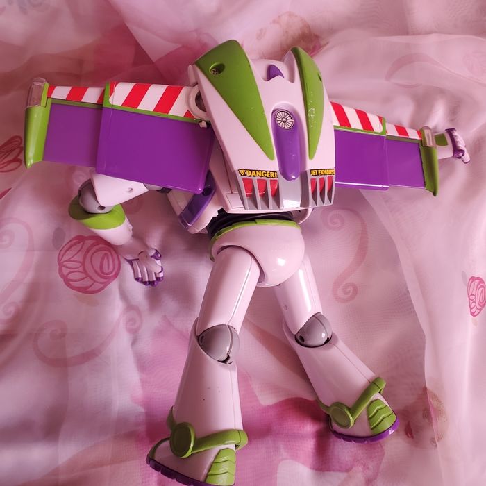 Buzz l'éclair _30 cm_ Version parlante française 🚀 _en très bon état 🔊 parle en français avec sa vraie voix du film bouton sur l'armure pour déclencher les réplique officielles 💡 Effets lumineux Laser lumineux sur le bras droit pour un rendu fidèle à l'univers Toy Story 🪖 Casque sans visière 🧚‍♂️ Ailes automatique Appuie sur le bouton rouge de l'armure les ailes s'ouvrent automatiquement et sont retractables . 🤖 Nombreux points d'articulation Bras, jambes, tête....poses variés pour jeu ou exposition 📦 Envoi rapide et emballage réalisé avec soin Protection maximale, photos avant envoi 🤖📦🚀 En très bon état Prix d'achat 229€