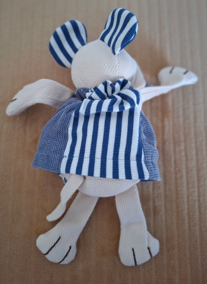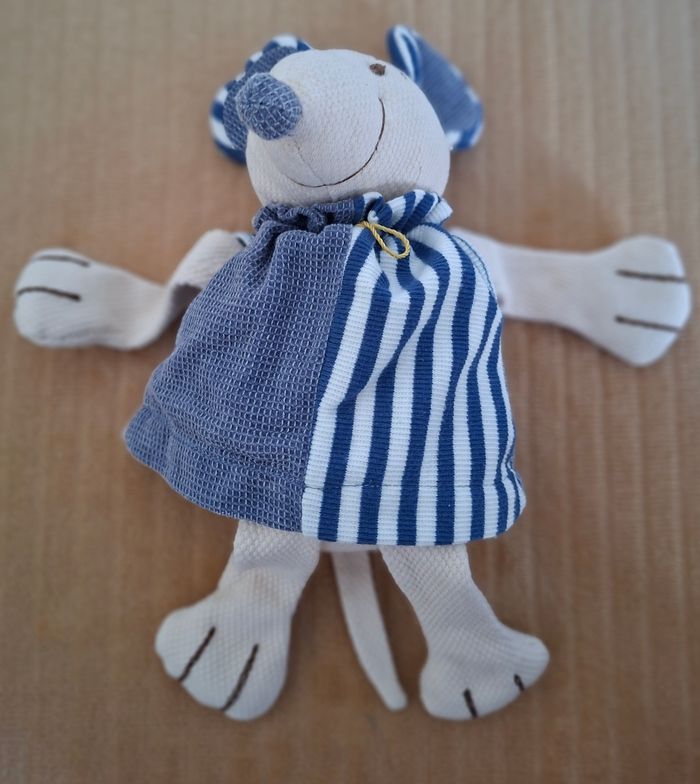 Doudou Souris Doudou et Compagnie Robe Bleue et Rayures Bleues et Beiges Billes Dans Les Pieds/Mains Comme Neuf