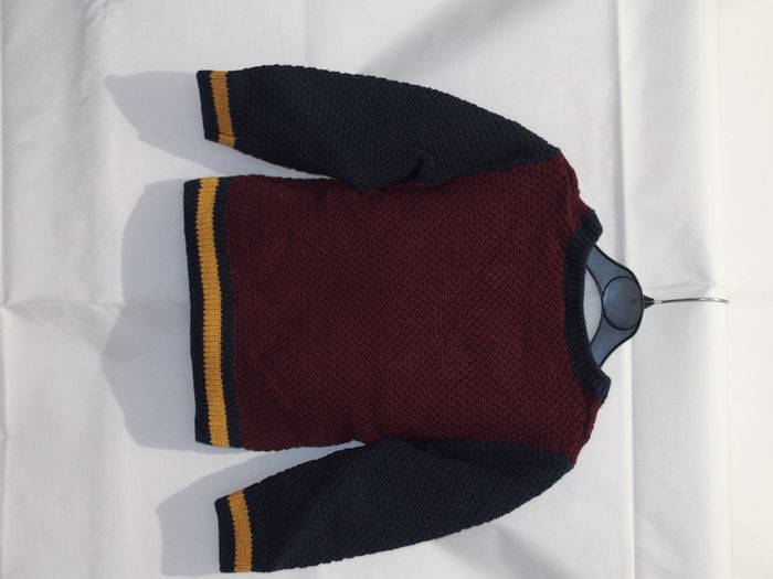 Pull style laine tricoté de chez TAO. Les couleurs rappellent celles de Harry Potter ! Porté mais reste en très bon état sans tâches ni trous. Taille 2 ans / 86 cm