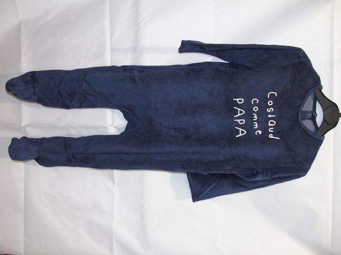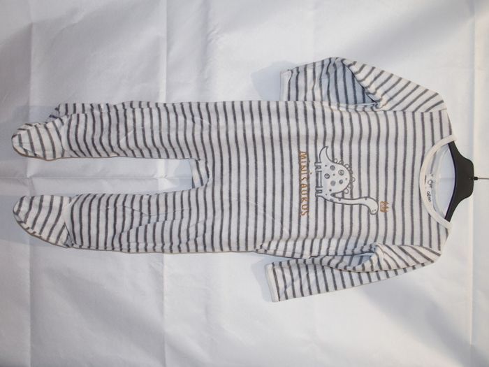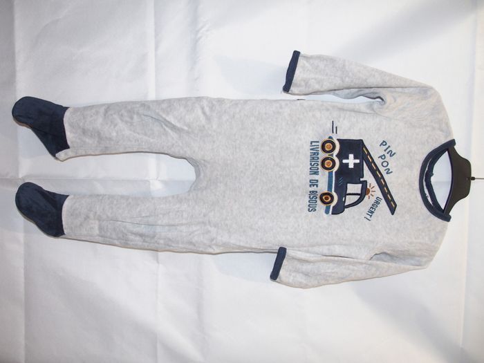 Lot de 3 pyjamas velours en très bon état. Ils ont été portés mais pas de tâches ni de trous. Uniquement au niveau du col sur le rayé, une micro-tâche qu'on peut voir sur la dernière photo. Fermeture sur l'arrière pour tous. Marque Kiabi et Gemo