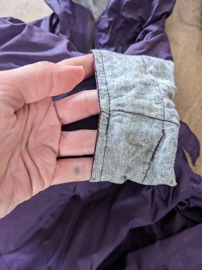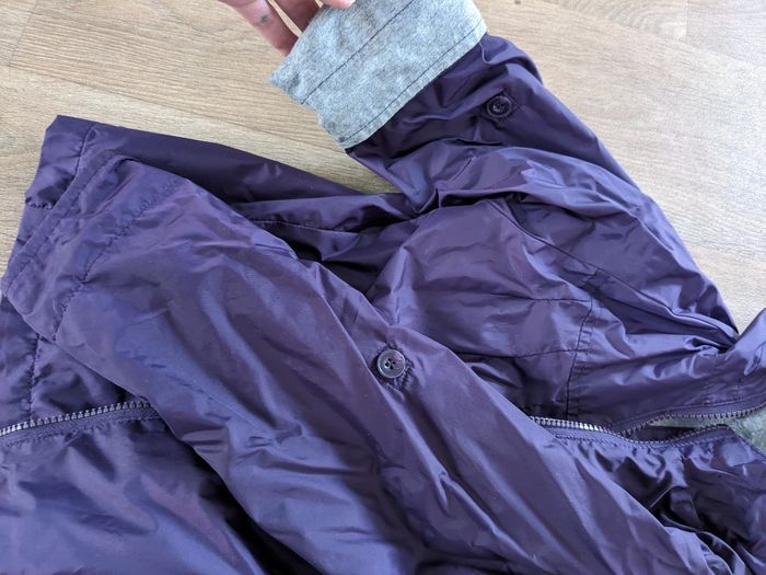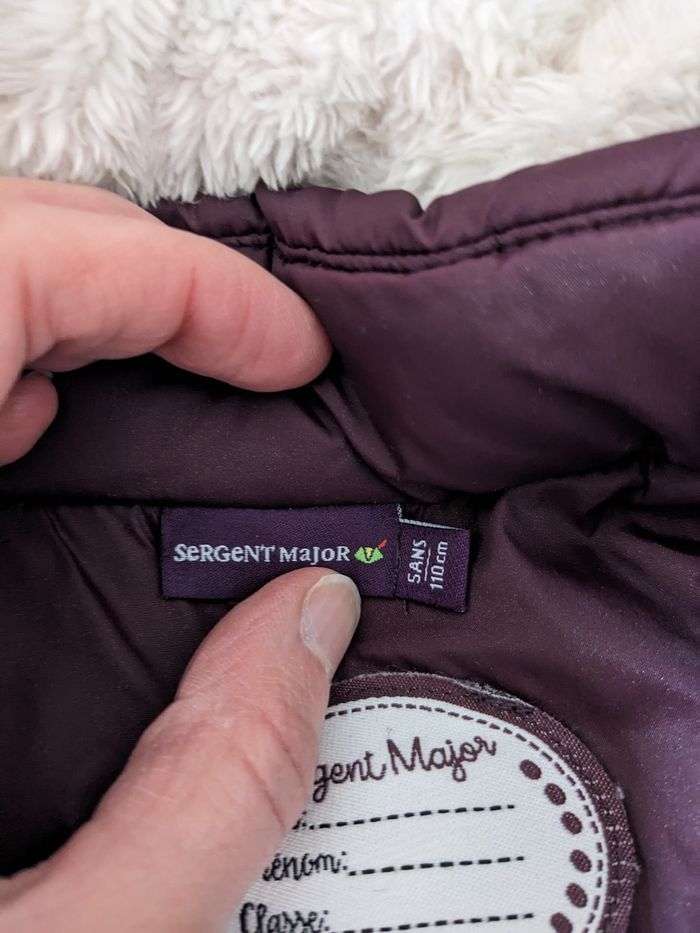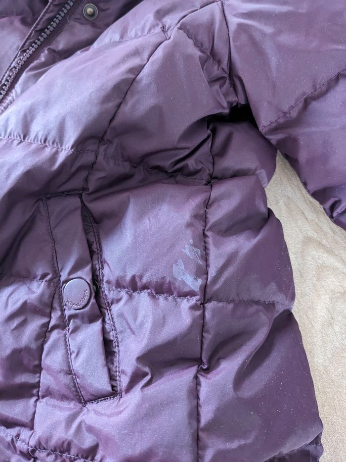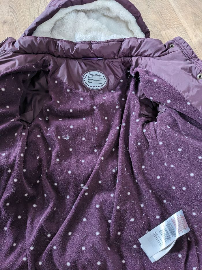Un manteau chaud sergent major 5 ans, violet et finalement pailletté Un imperméable CFK 6 ans (taille 5 ans), manches qui peuvent se remonter avec un bouton, tres pratique!!! Bien portés, mais pas de trous. Petite tache sur le flanc sur le sergent major voire photo, et peluches a l interieur et petites taches sur le revers des manches sur l imperméable voire photo mais sinon OK!!