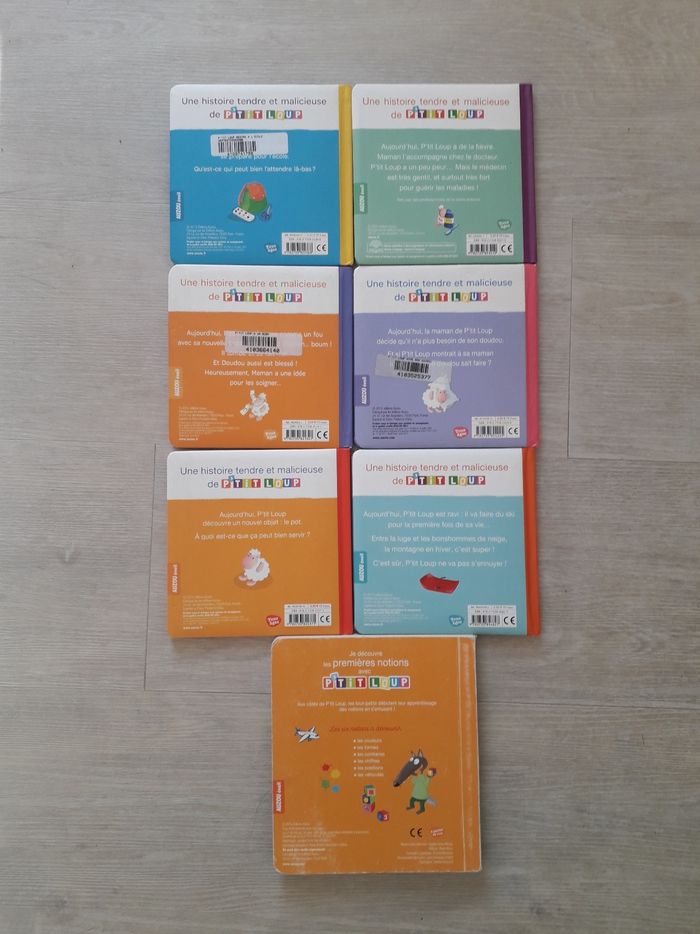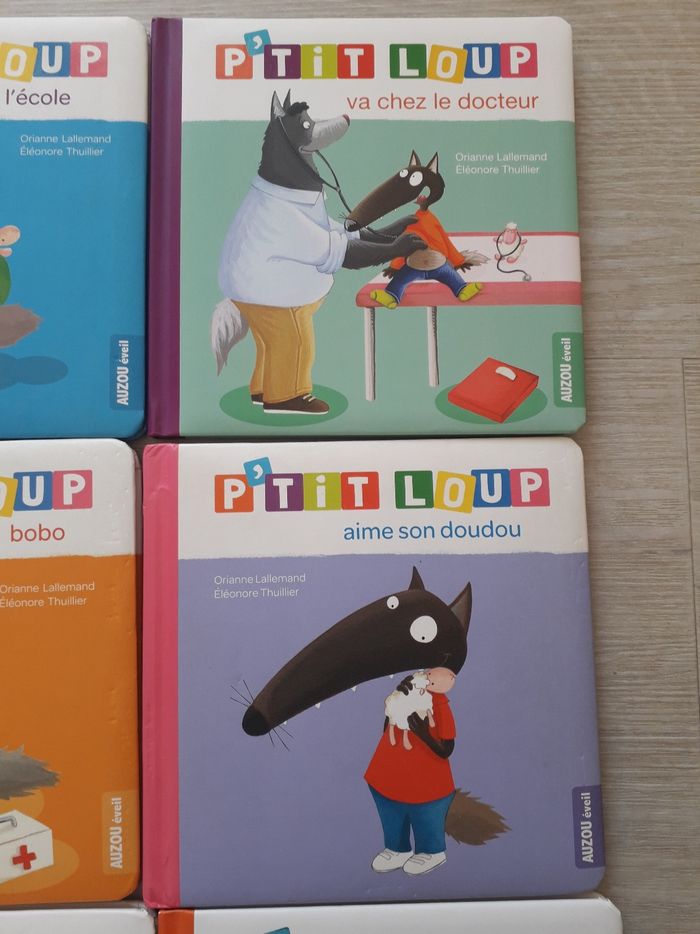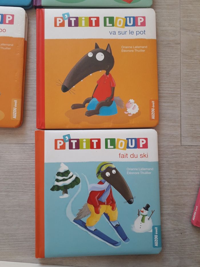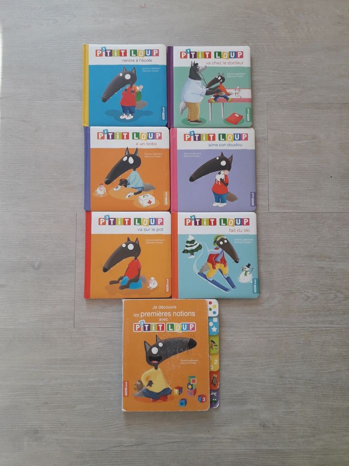 Lot de 7 livres de P'tit Loup. Certains sont en très bon état, d'autres en bon état (quelques traces sur la couverture: voir les photos). Tous sont en très bon état à l'intérieur ! - P'tit Loup fait du ski - P'tit Loup rentre à l'école - P'tit Loup va chez le docteur - P'tit Loup aime son doudou - P'tit Loup va sur le pot - P'tit Loup a un bobo - Je découvre les premières notions avec p'tit loup (couleurs, formes, chiffres, contraires, positions, véhicules)