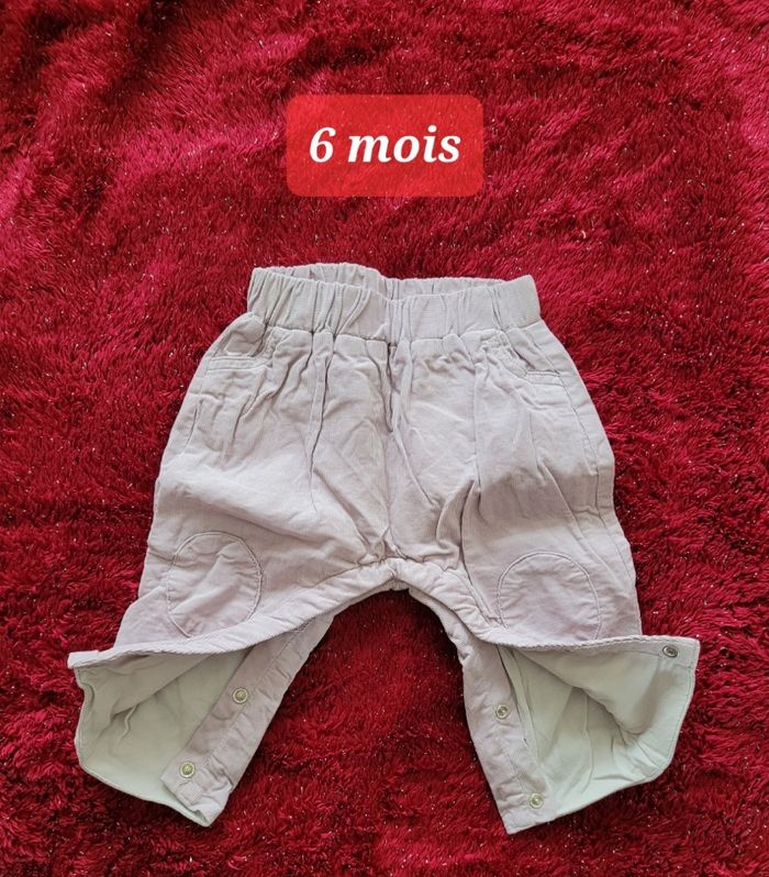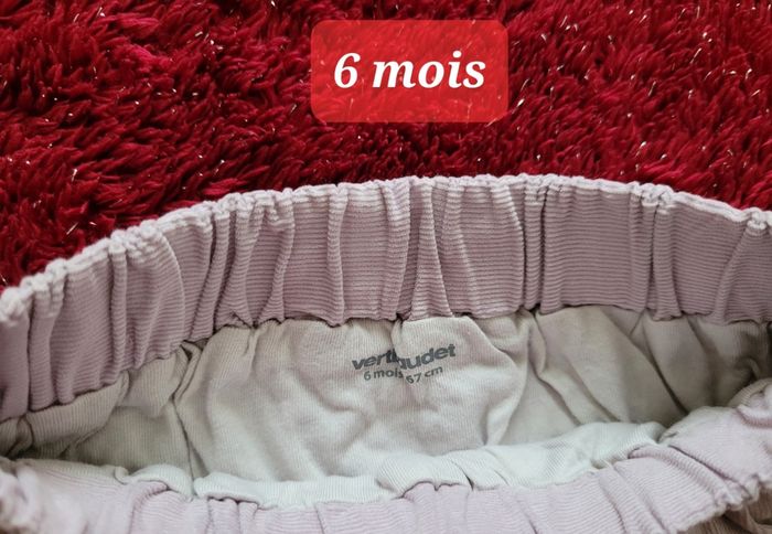 Vends ce joli pantalon de la marque Vertbaudet, taille 6 mois (67 cm). Matière : Velours côtelé tout doux, parfait pour garder bébé au chaud. Couleur : Vieux rose / Lilas pâle (très facile à assortir). Pratique : Ouverture complète par pressions à l'entrejambe pour faciliter le change sans déshabiller complètement bébé. Détails : Jolies finitions avec renforts aux genoux (empiècements ronds) et taille élastiquée pour plus de confort. État : Très bon état, peu porté. Maison non-fumeur. Envoi rapide et soigné ! 📦