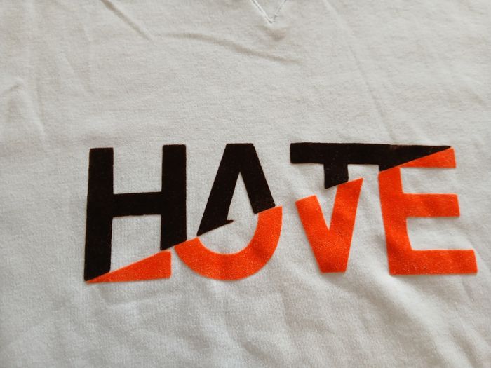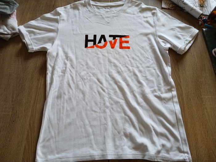 T-shirt blanc a manches courtes Celio. Marqué "Hate/Love" sur le devant. Neuf, jamais porté. Taille M