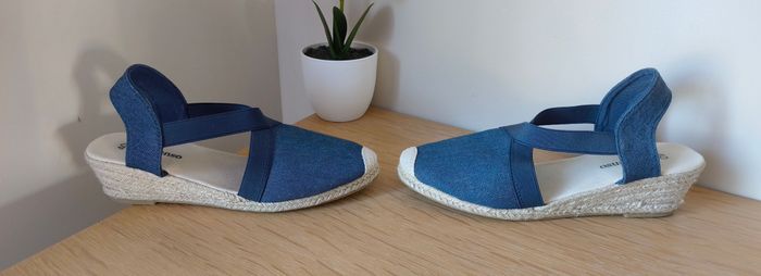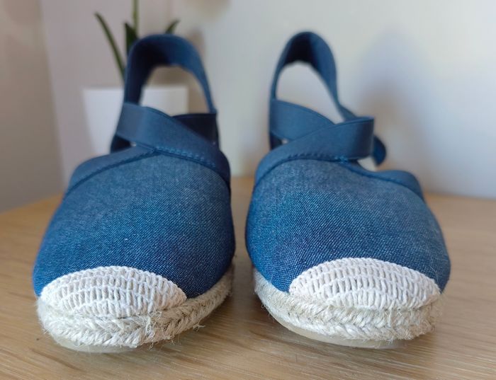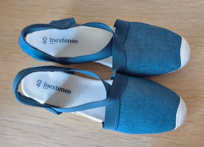 Sandales fermées de la marque IN EXTENSO - Aspect toile marine et crème - Style espadrilles compensées - Lanières élastiques - Talon : 6 cm - Pointure : 40 ℹ️ Neuve (jamais portées) car erreur de pointure #kat02600chaussuresfemme40 #sandalecompensee40 #sandaleespadrille40 #chaussurefemme40 #inextenso