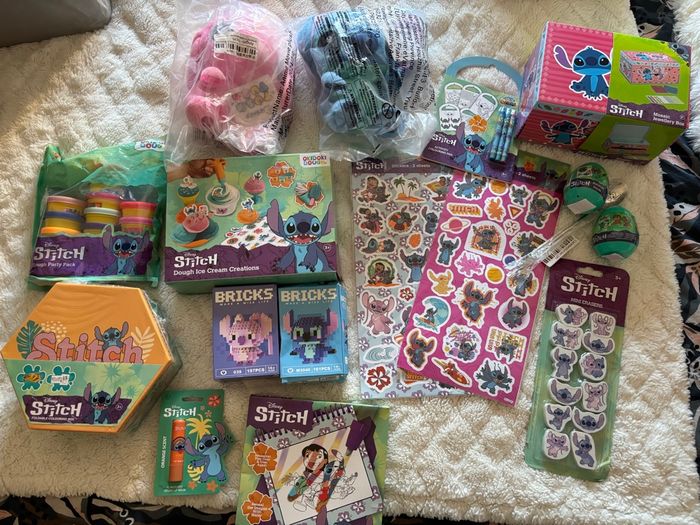 Joli lot Stitch composé de 2 petites peluches, une boîte à bijoux, de la pâte à modeler, des stickers /autocollants, des gommes, un stick à lèvres, des bricks à construire, un livret a eau, des œufs surprises, une cuillère, une boîte de crayons/feutres et un mini cahier de coloriage. Tout est neuf!