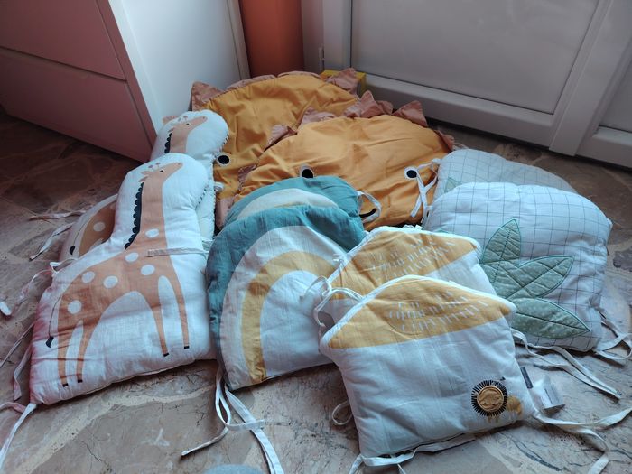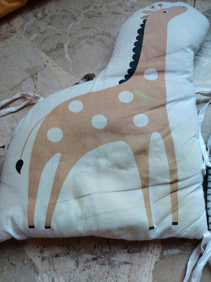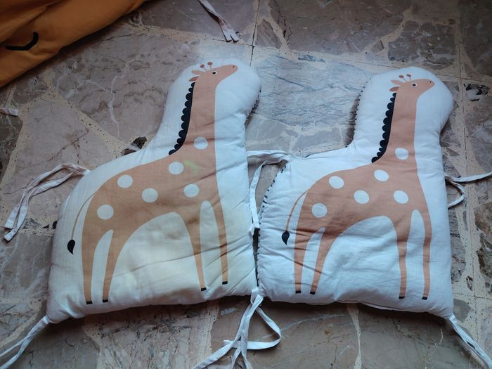 Les éléments se fixent par des nouettes aux barreaux sur le côté extérieur du lit ou parc. Dimensions - Tour de lit complet 30 x 360 cm : 10 coussins dont 2 plus larges pour la tête et le pied de lit . Le tour de lit est adapté aux lits bébé de dimensions 60x120 cm et 70x140 cm. 1 élément girafe avec une petite décoloration (cf photo)