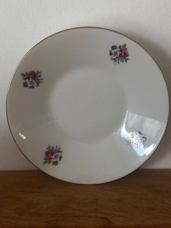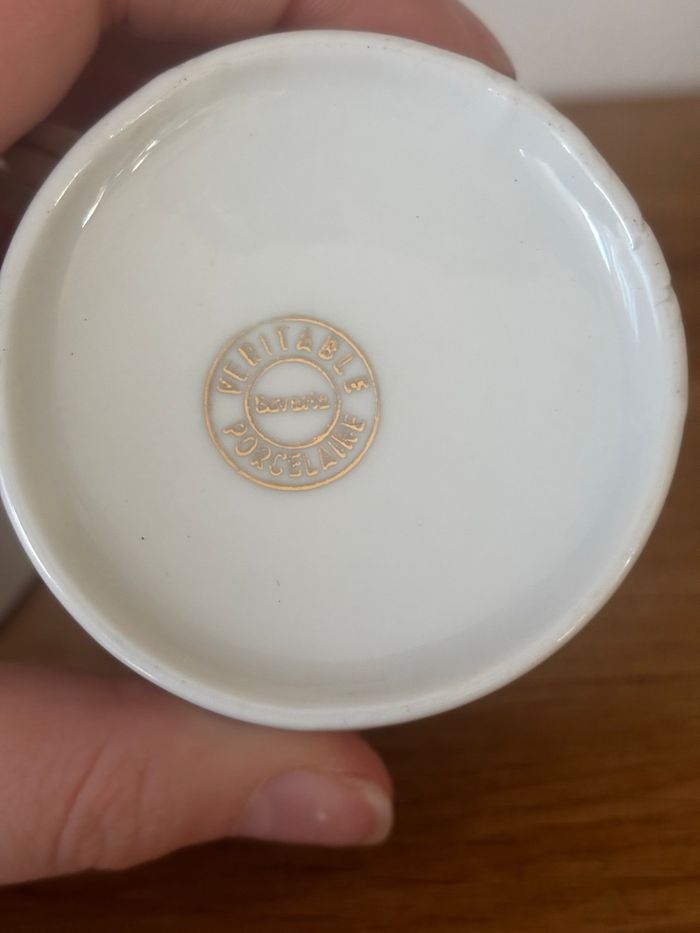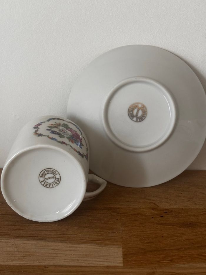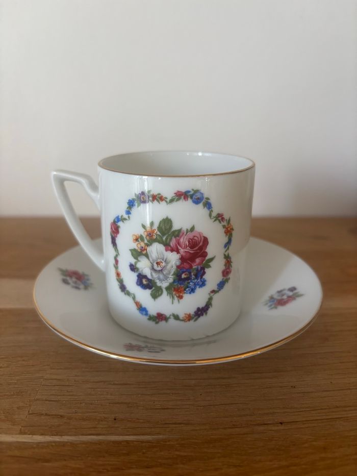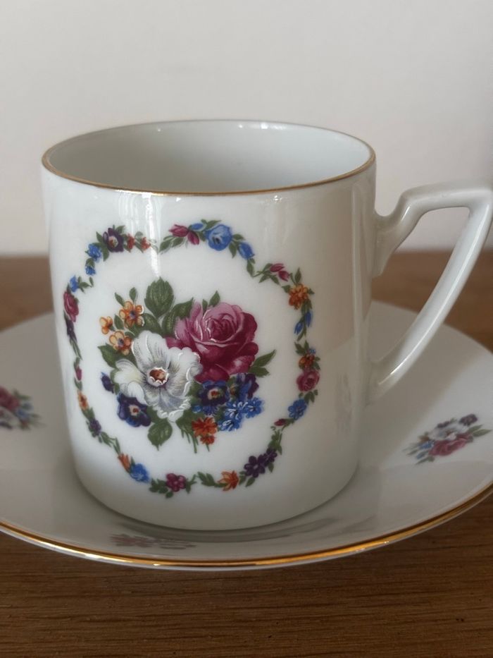 Vintage ancien délicat ensemble de 6 tasses avec soucoupes En porcelaine Allemande Bavaria Décor fin de fleurs entrelacées avec finition liseré doré En très bon état pour l’époque Soucoupes : diamètre = 11 cm Tasses: diamètre 5,5 cm et hauteur 6 cm
