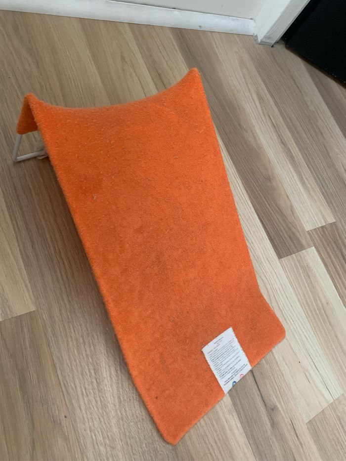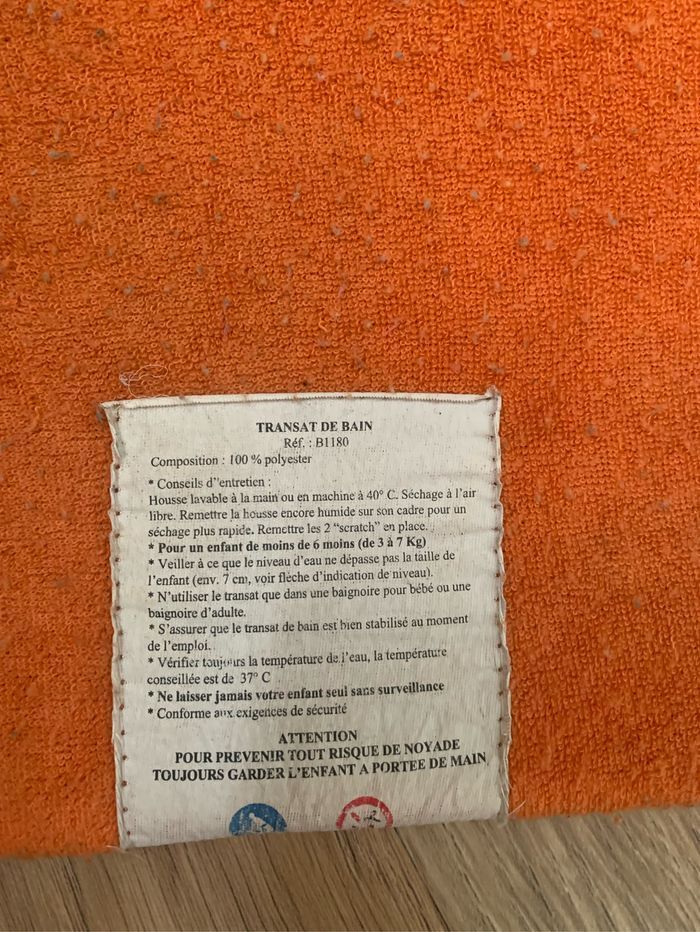 Transat de bain orange pour bébé en tissu Très pratique , bébé ne glisse pas dans le bain La housse lavable s’enlève par les scratches Un peu bouloché