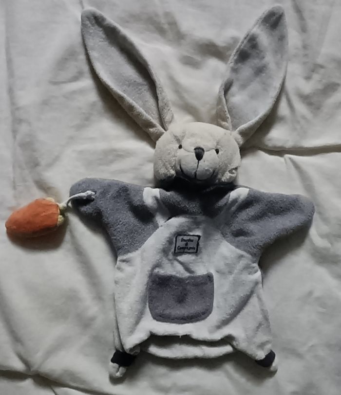 Doudou Lapin La compagnie des petits Peut servir pour avoir en double... Ou si perdu Est coupé sur la joue mais possible de reprendre