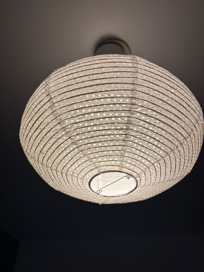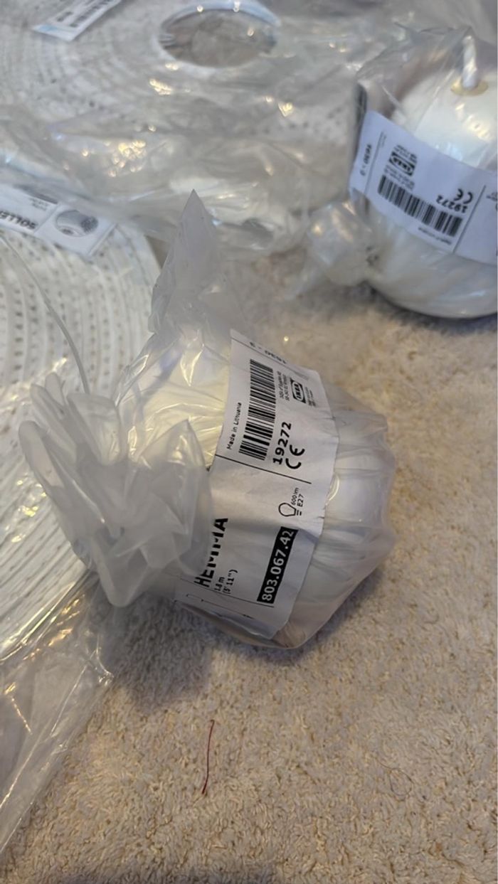 Vends 2 suspensions IKEA SOLEFTEÅ (abat-jour papier blanc à pois, diamètre 45 cm) + 2 cordons électriques HEMMA (longueur 1,5 m, coloris blanc). • État : neuf, jamais utilisé, encore dans l’emballage • Design léger, ambiance douce et cocooning. • Très simple à installer.