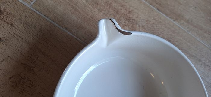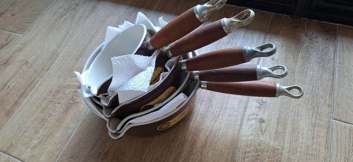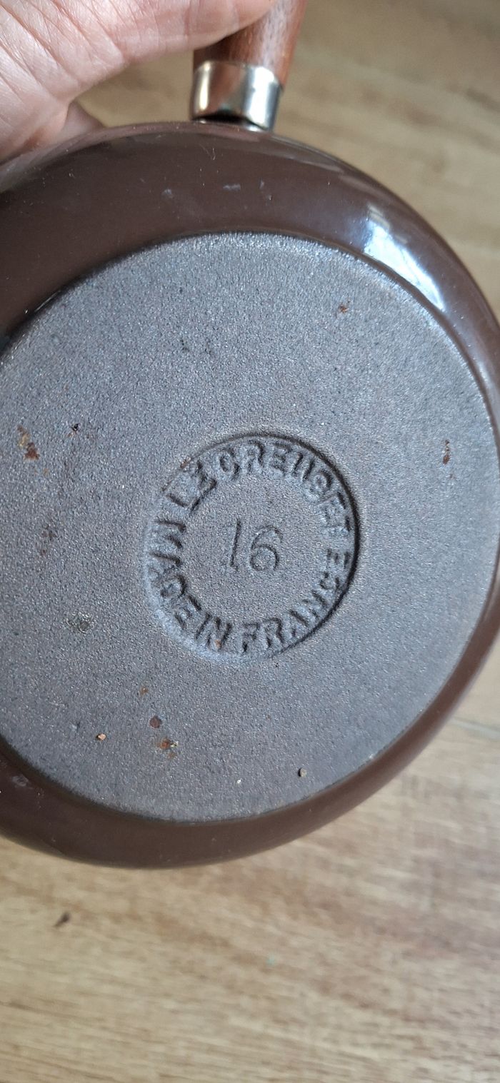 Neuf avec étiquette d'époque ! 5 casseroles diamètres 14, 16, 18, 20 et 22. Email sauté sur un endroit sur la diamètre 20, voir photo. ATTENTION, PAS DE LIVRAISON, TROP LOURD Autres photos à la demande notamment pour les défauts
