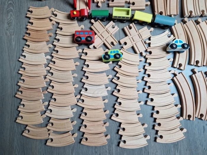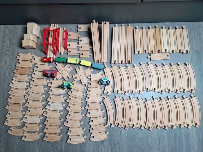 Gros lot pour circuit en bois. 108 pièces! -1 locomotive, - 4 wagons -3 voitures, - 4 blocs - 96 rails. En très bon état!