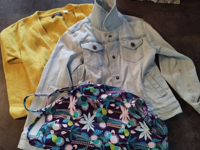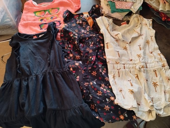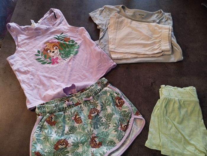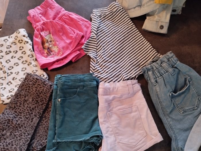 Lot vêtements fille 6 ans comprenant Deux leggings courts, 3 shorts, deux jupes Une veste en jean avec une tâche voir photo, un maillot de bain et un gilet type boléro 3 robes et une combinaison short 11 t-shirt manches courtes et un débardeur Un pyjama Stella, un pyjama short et un short de pyjama Un lot de vêtements donn avec un gilet et trois t-shirt car tâchés Le tout a été porté mais peut-être encore utilisé.