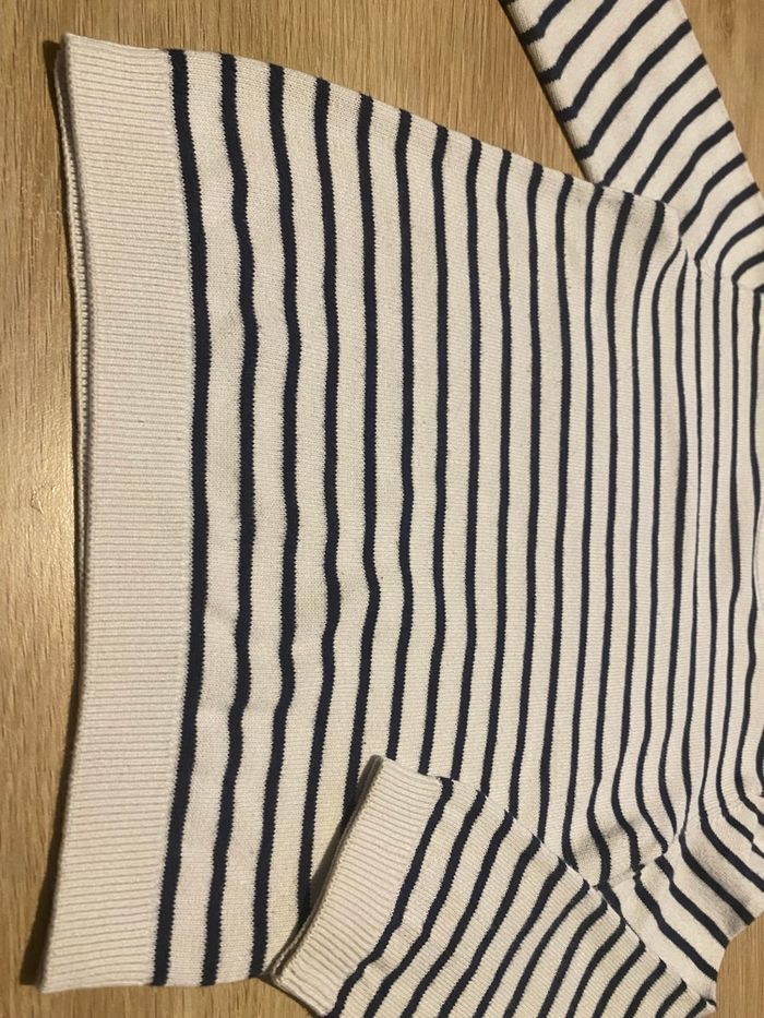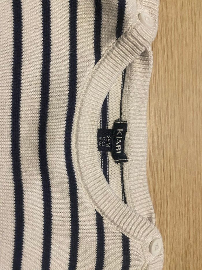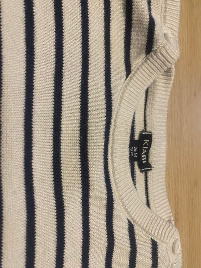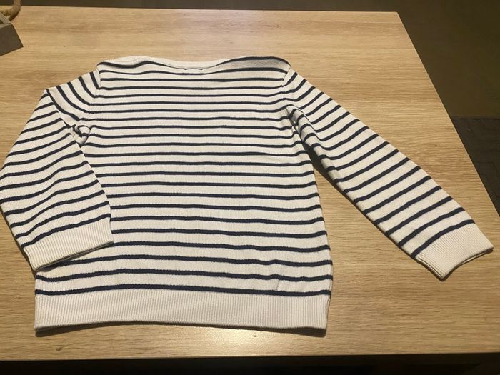 Pull kiabi en très bon état taille 36 mois avec 2 boutons sur les épaules. Couleur blanc , marine Coton