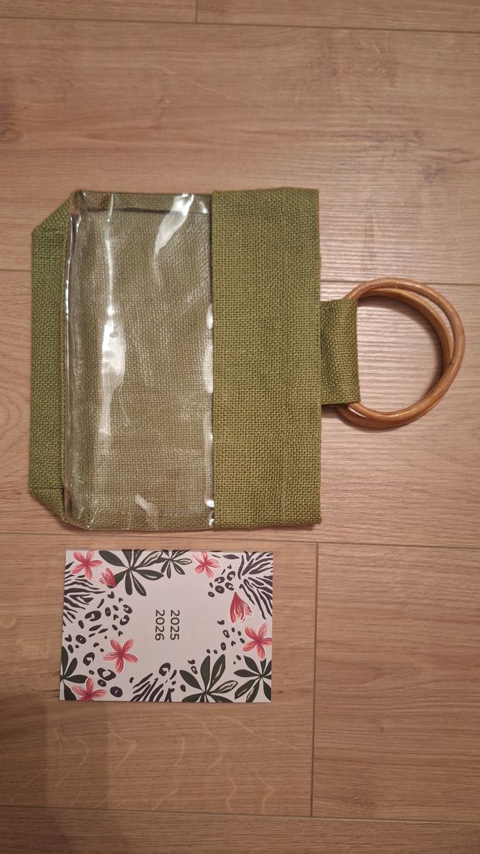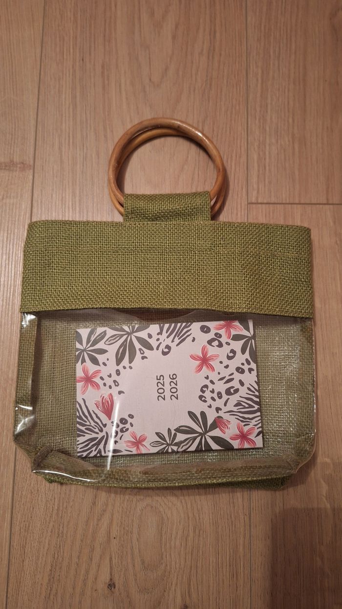 Sac à main type toile de jute vert 24x19x10cm et agenda neuf