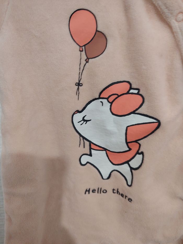 Coloris rose pâle avec motif Marie tenant des ballons et inscription “Hello there”.