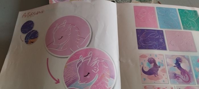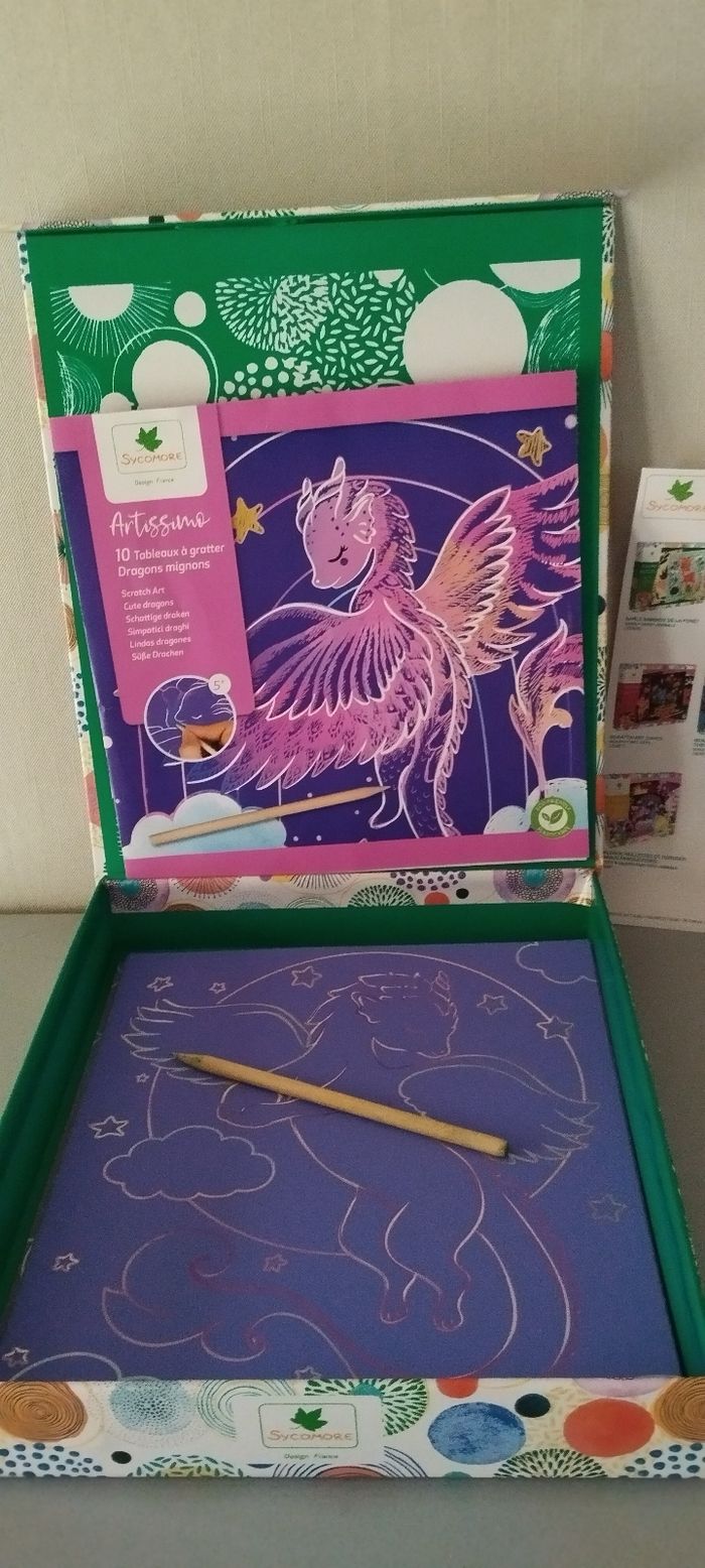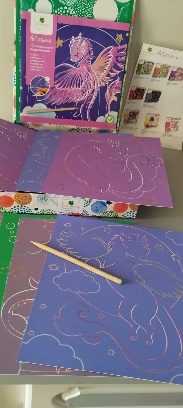 Coffret de 8(2 ont été utilisés) tableaux de dragons mignons à gratter. Marque Sycomore A partir de 5 ans Très bon état.