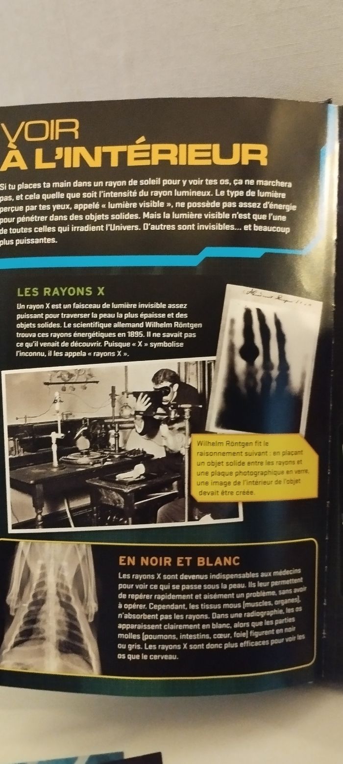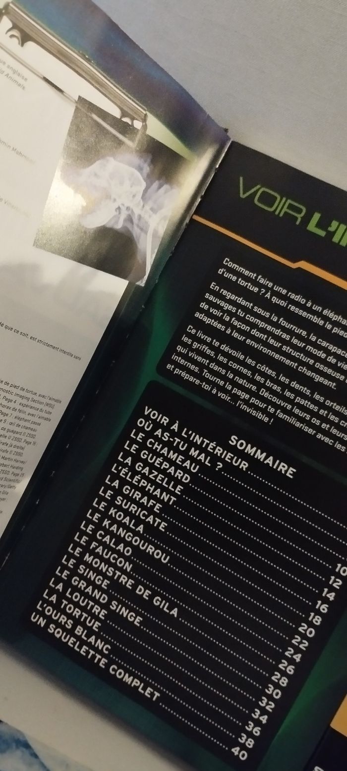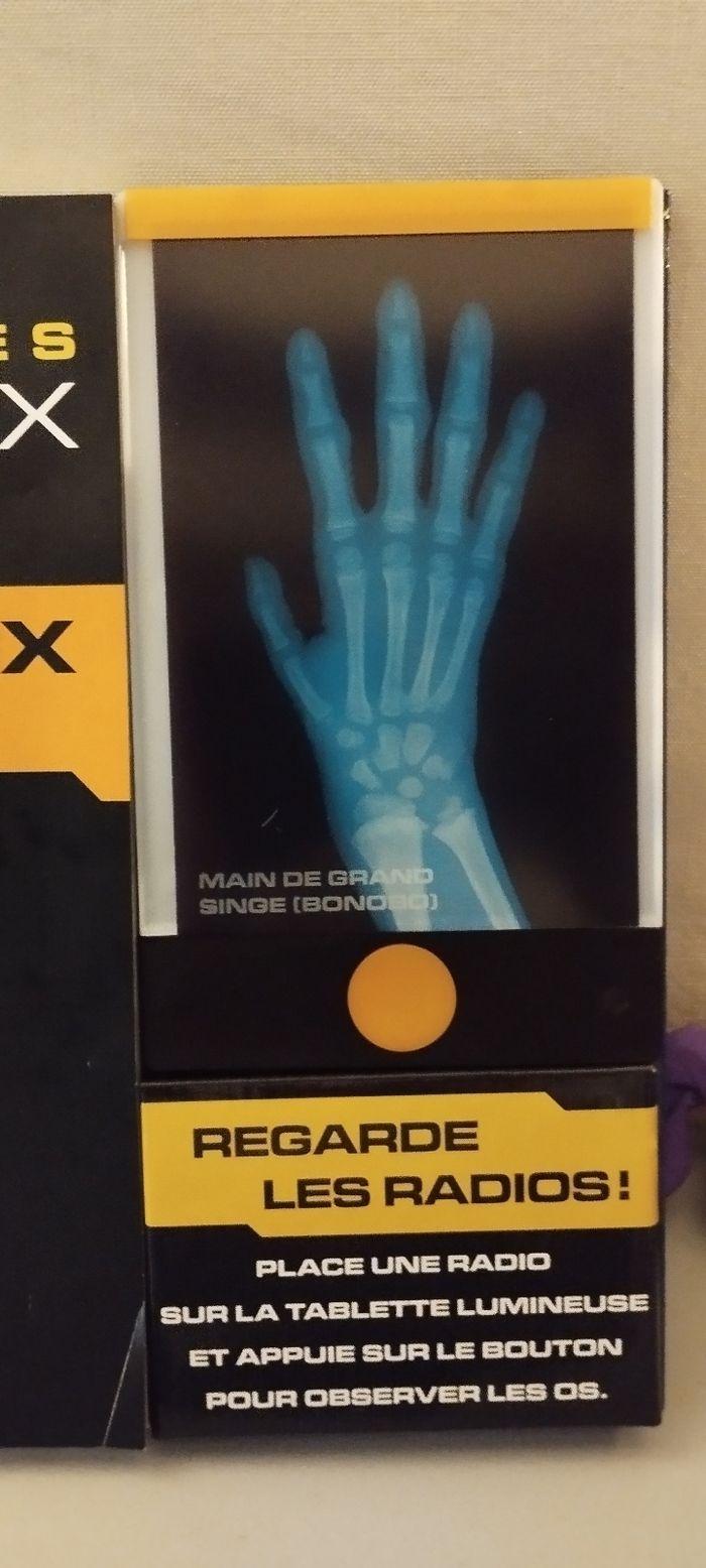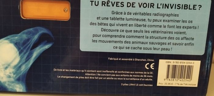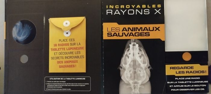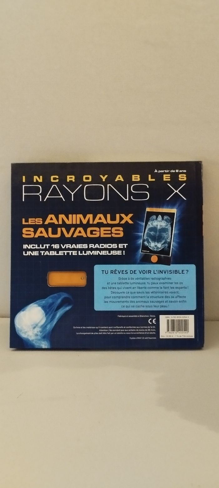Tu rêves de voir l'invisible ? Grâce à de véritables radiographies et une tablette lumineuse, tu peux examiner les os des bêtes qui vivent en liberté comme le font les experts ! Livre avec 16 vraies radios et une tablette lumineuse. A partir de 8 ans. Fonctionne avec 3 piles LR44 incluses. Très bon état.