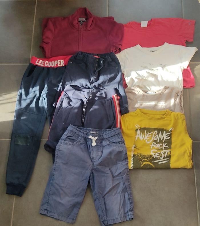 Lot 9 vêtements comprenant : 🔹1 pantacourt bleu marine 🔹2 bermudas bleu marine 🔹2 tshirts manches courtes (petit bateau,marque divers) 🔹2 tshirts manches longues 🔹1 pantalon jogging Lee cooper 🔹1 gilet zippé complices Taille 8 ans Bon état général