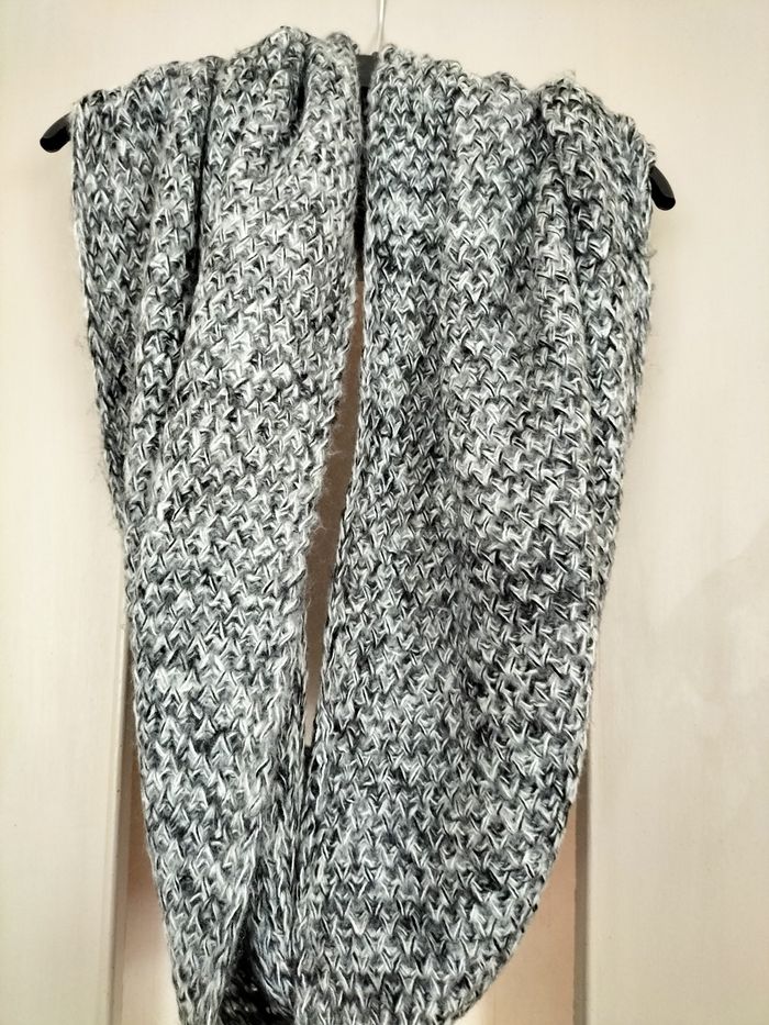 Écharpe tour de cou noir, gris et blanc chiné, un fil tiré à l'intérieur