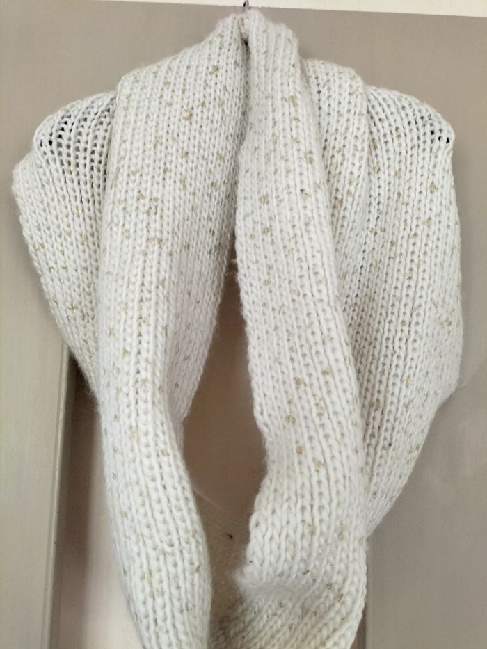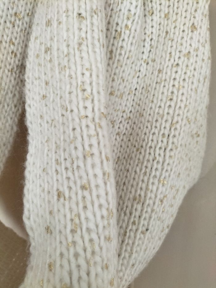 Écharpe tour de cou blanc cassé et doré, un petit défaut au niveau d'une maille