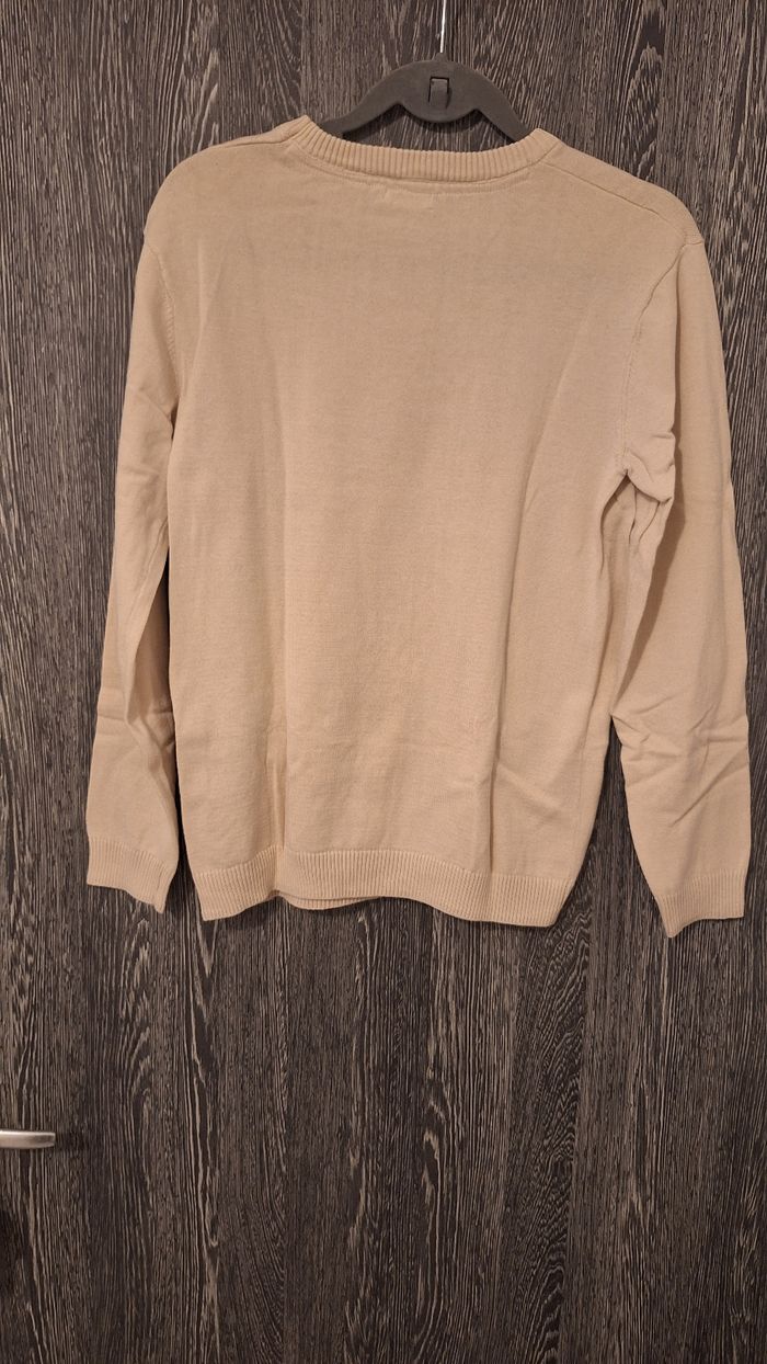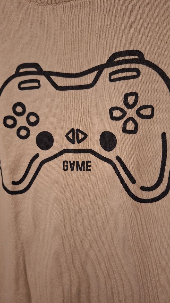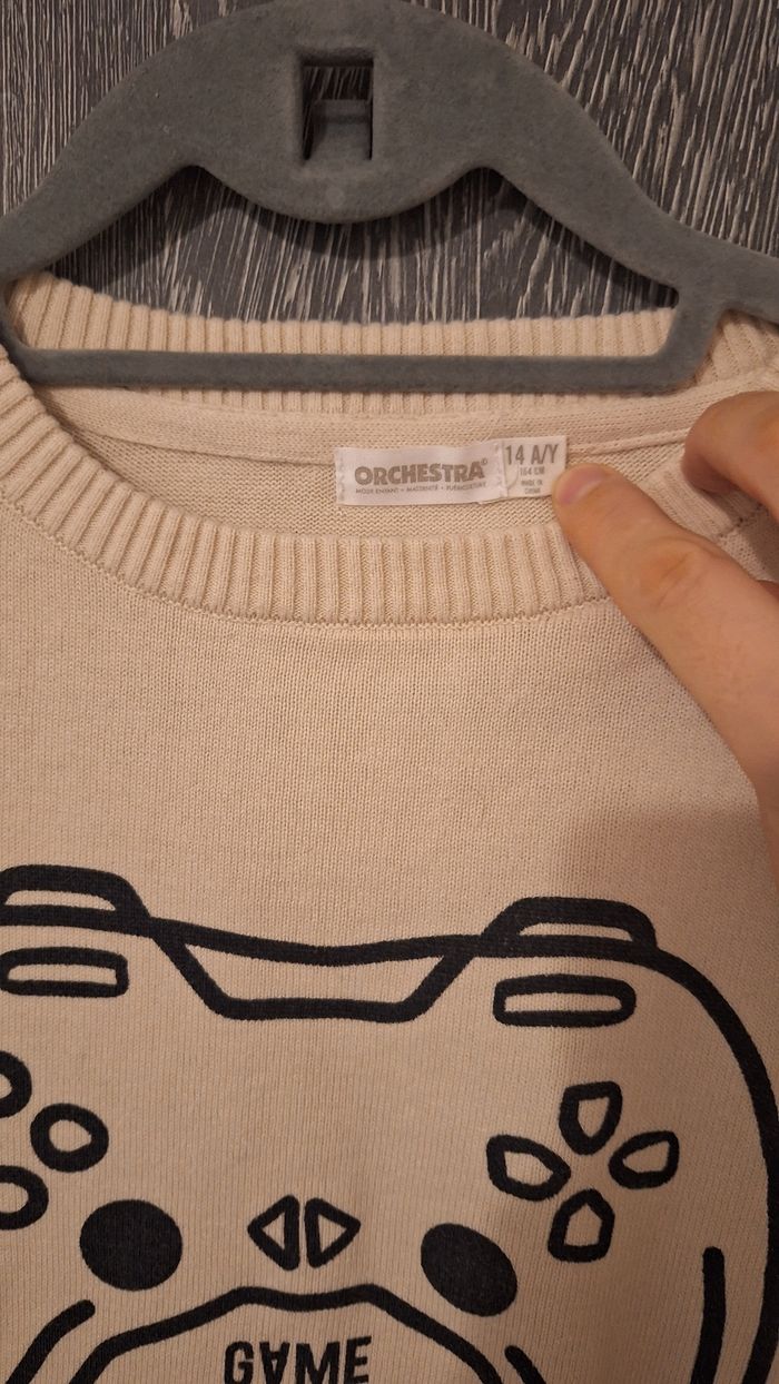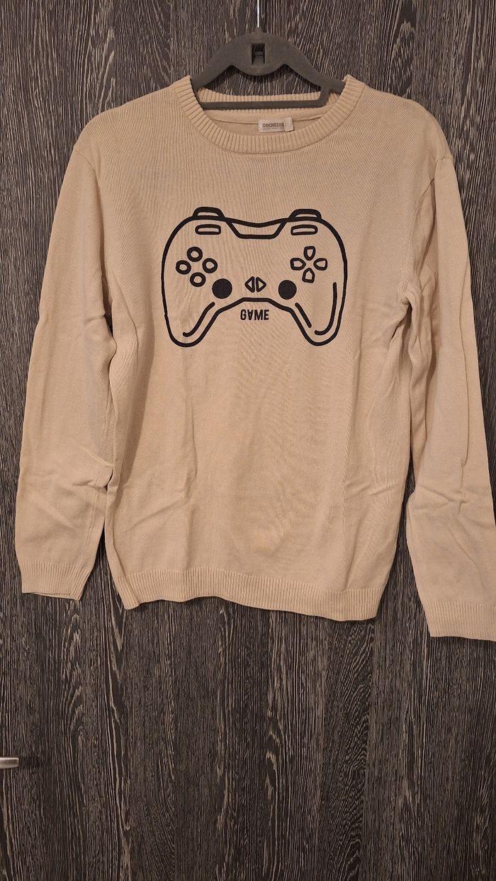 Bonjour ✴️Je vends ce pull neuf sans étiquette ✴️De la marque Orchestra ✴️Taille 14ans 164cm ✴️Uni beige avec imprimé manette noire ✴️Manches longue et col rond ✴️Bord-côtes au niveau de la base et manches extensible ✴️100% coton