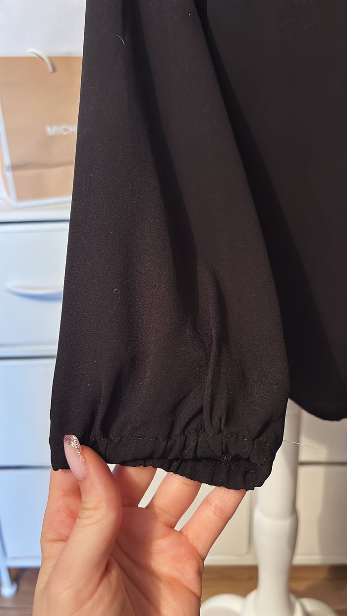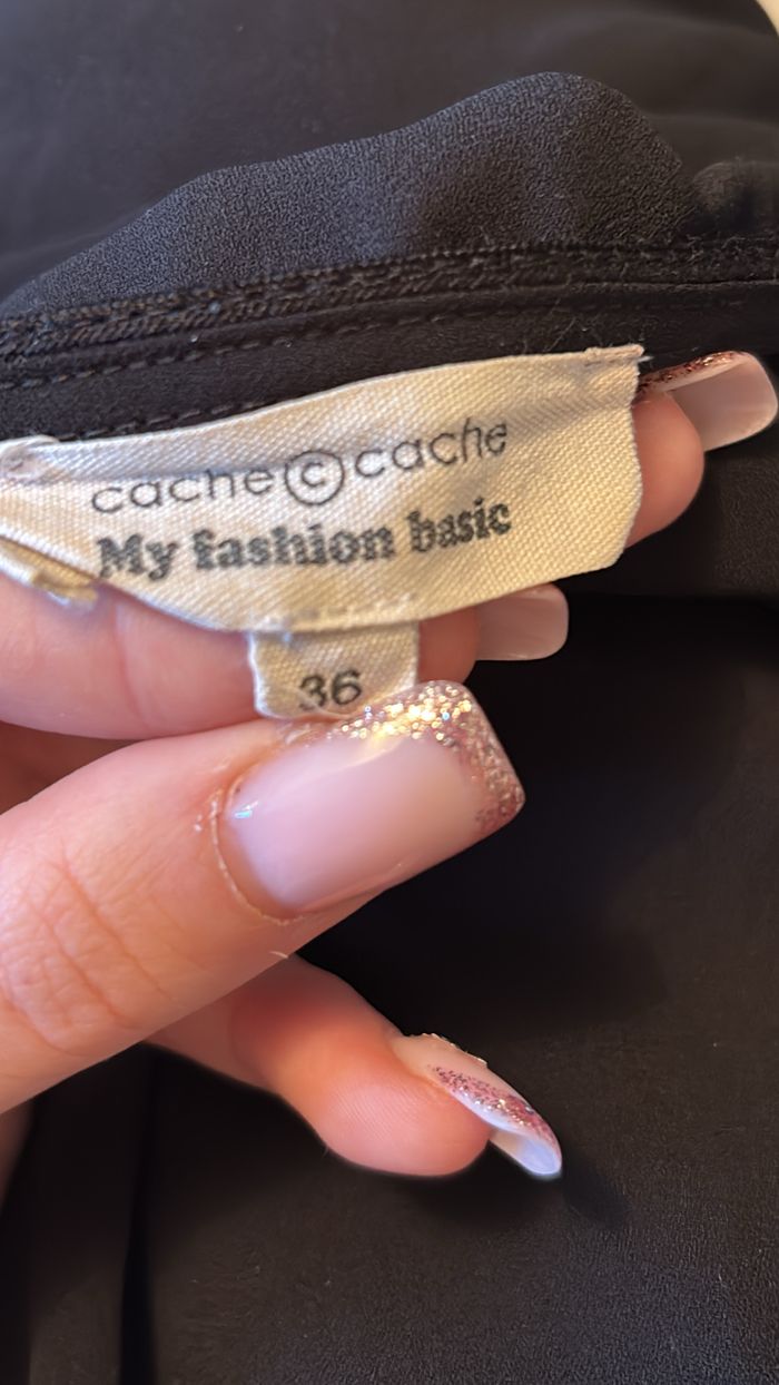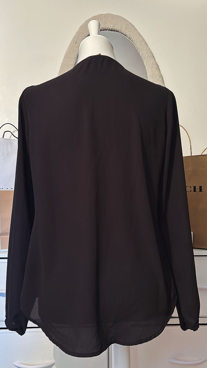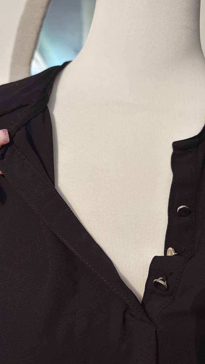 4,5€. 🪩 Blouse noire fluide 💙 Coupe droite 📏 Dimensions : longueur 68cm, largeur 49cm 📦 État : Très bon état Blouse fluide noire, coupe droite. Col tunisien avec petits boutons argentés. Manches longues avec poignets élastiqués.