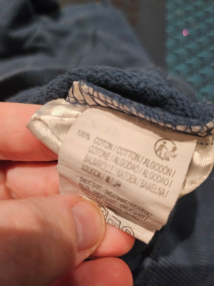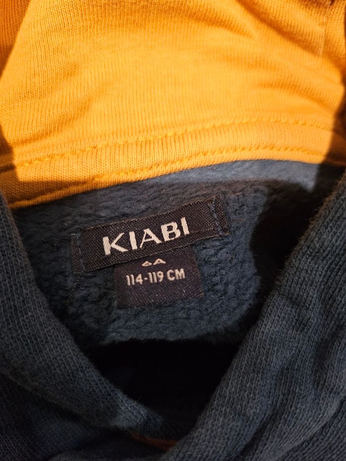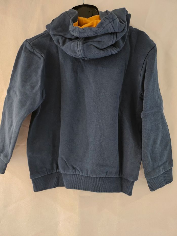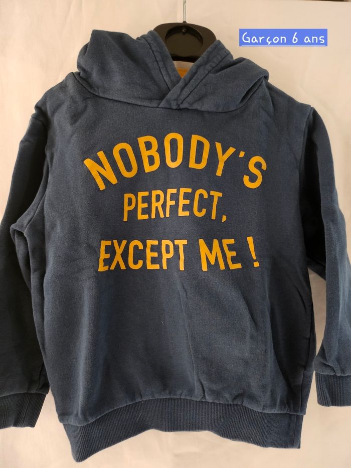 Pull sweat à capuche bleu avec écriture moutarde. Marque : Kiabi Taille : 6 ans