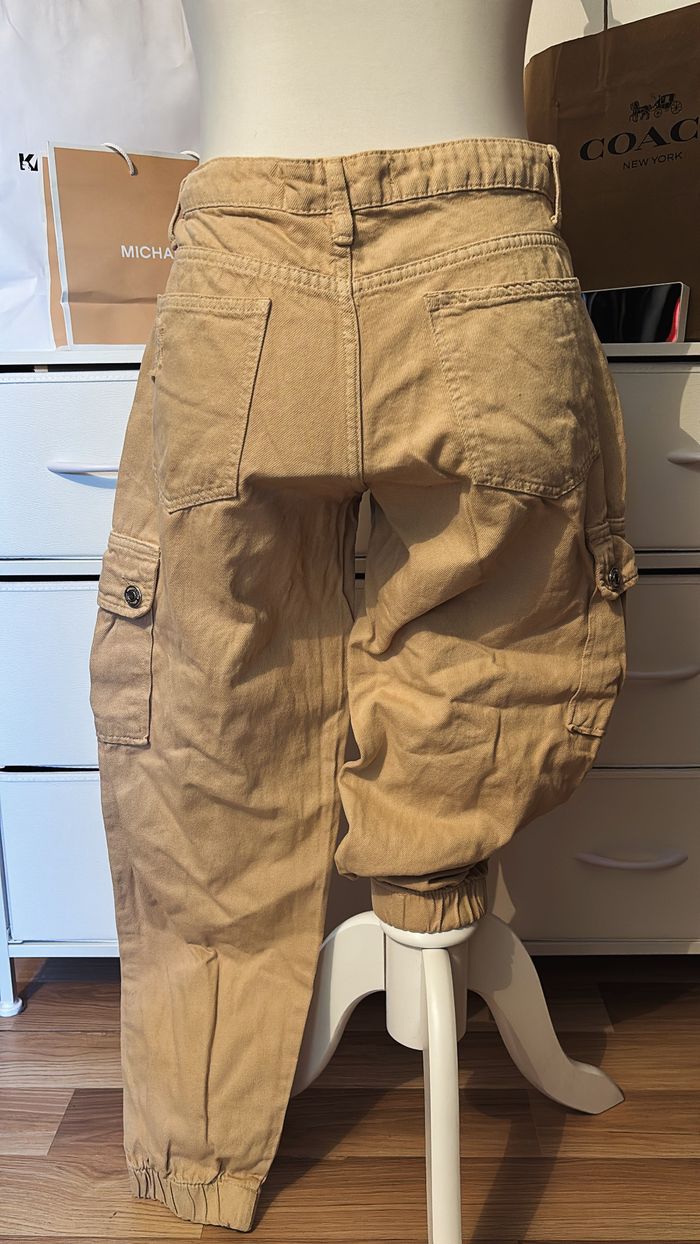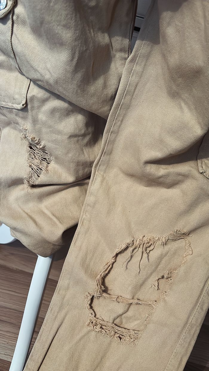 3,5€. 🪩 Pantalon cargo beige style jogger 📏 Dimensions : longueur 85cm, largeur 38cm 📦 État : Très bon état Matière : 100% coton Pantalon cargo beige, coupe avec chevilles resserrées. Détails destroy avec déchirures effet usé sur les jambes. Poches cargo latérales + poches classiques devant et derrière. Fermeture bouton et zip.