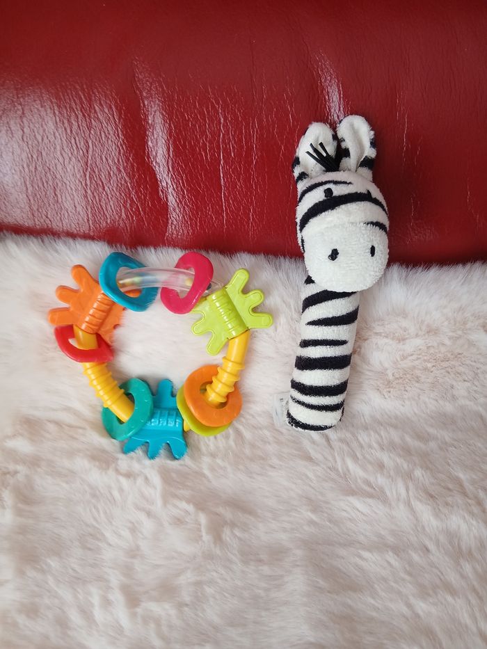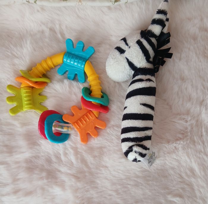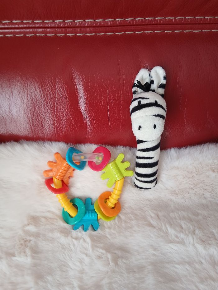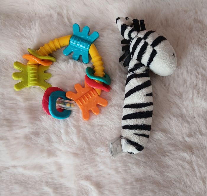 Mini-doudou Zèbre "pouet-pouet" +Hochet multicoloris - photo numéro 1