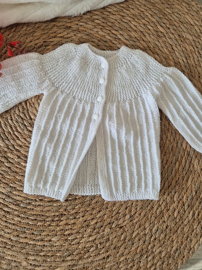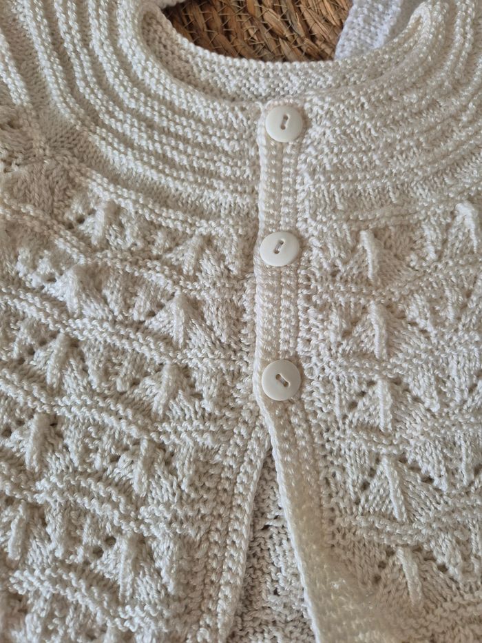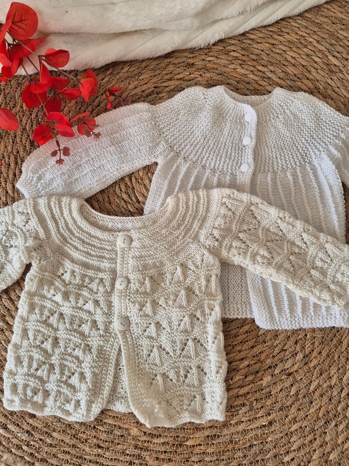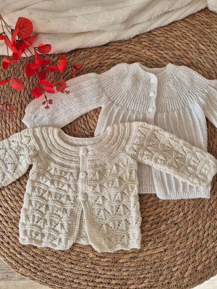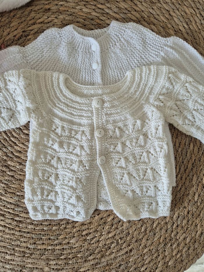 2 sublimes brassières de laine 0/3 mois. Très bon état, mixte, aux superbes points de croix. Articles indispensables dans la valise de maternité, prisés des sages femme. Envoi rapide et soigné