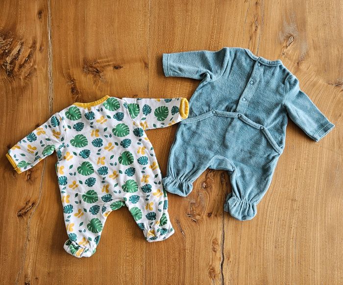 Lot de 2 pyjamas bébé garçon. L'un est bleu (ouverture pressionnée dans le dos), l'autre est blanc avec des motifs de feuilles sur l'ensemble du pyjama (ouverture pressionnée sur le devant et à l'entrejambe). Porté mais reste en très bon état. Aucune tâche, ni trou 👌