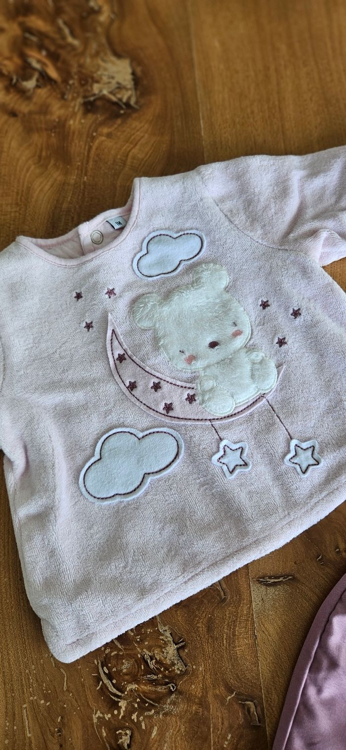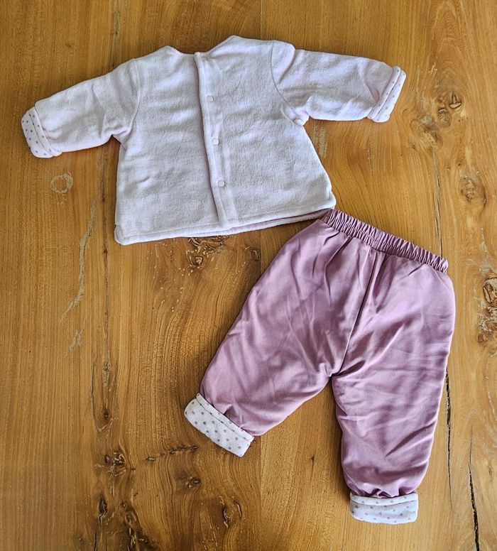 Ensemble hiver bébé fille : • Pull chaud en coton rose pâle avec des dessins brodés et un petit ours blanc en relief sur le devant. Ouverture pressionnée dans le dos. • Pantalon chaud rembourré en coton, violet, élastique à la taille. Porté peu de fois donc en parfait état. Aucune tâche, ni trou 👌