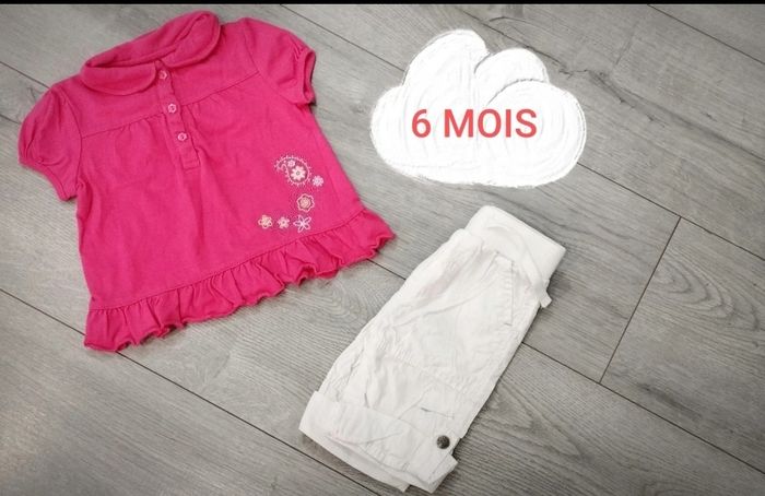 Ensemble fille taille 6 mois composée d'un : - Pantalon transformable en pantacourt (système de bouton pression) marque Zeeman. - Un t-shirt manches courtes motif fleurs marque Joe. 🎉🎉🎉 Remise activée sur les lots 🎉🎉🎉
