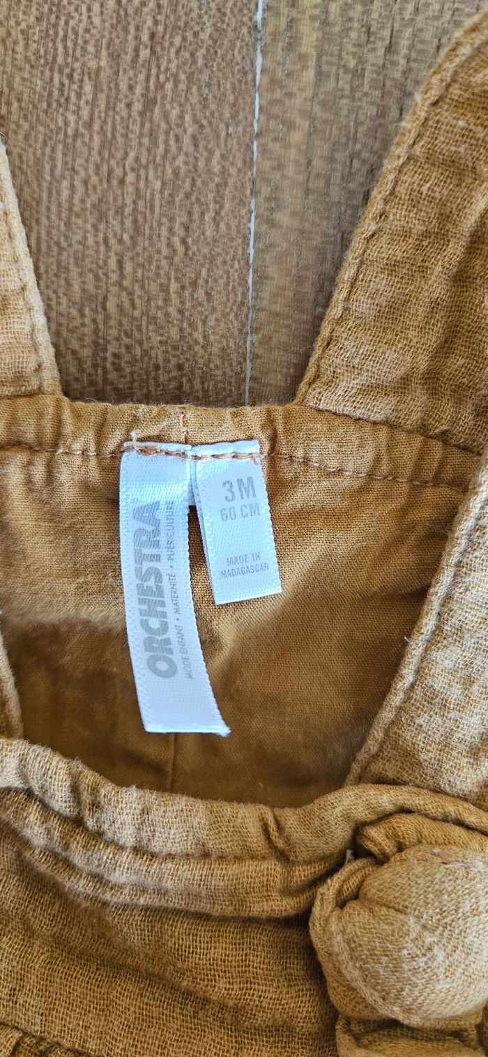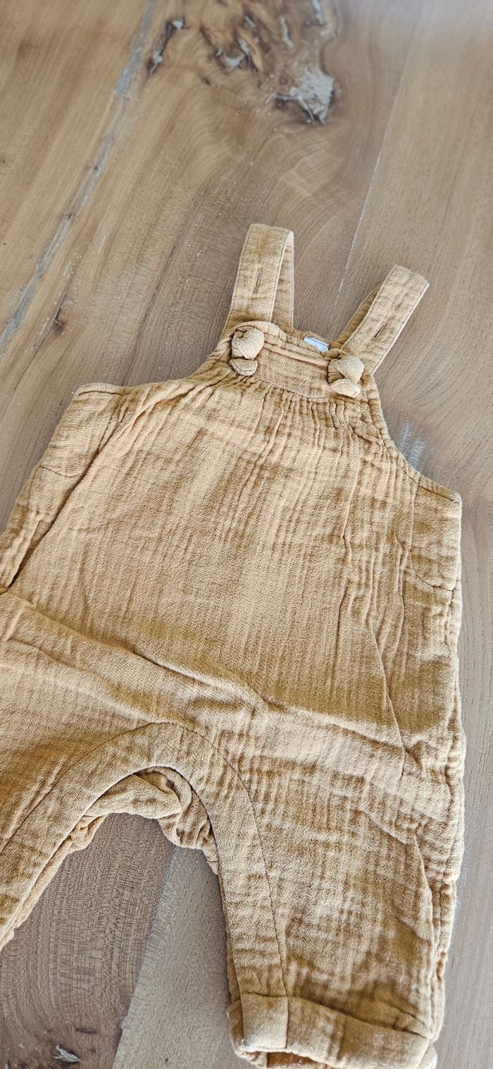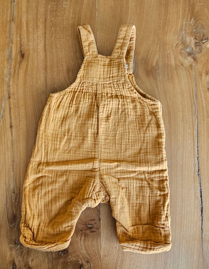 Salopette longue en coton couleur moutarde. Bretelles ajustables, ouverture pressionné sur les côtés, entrejambe pressionné. Porté mais reste en très bon état. Aucune tâche, ni trou 👌