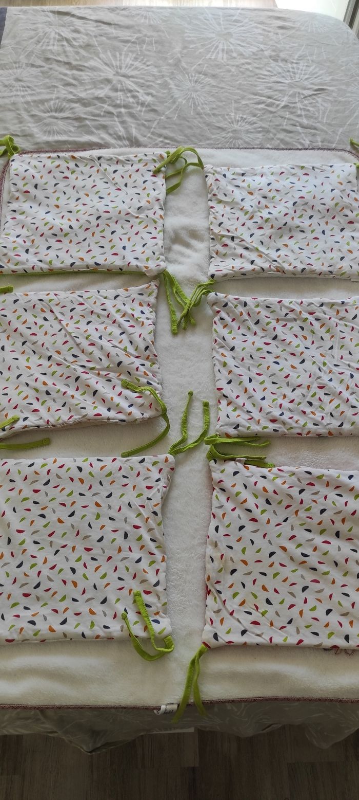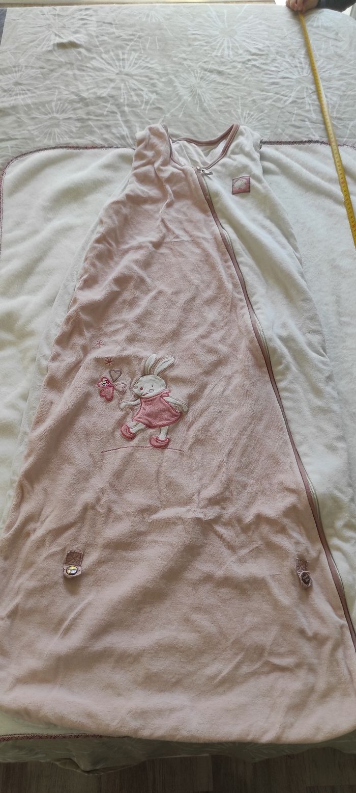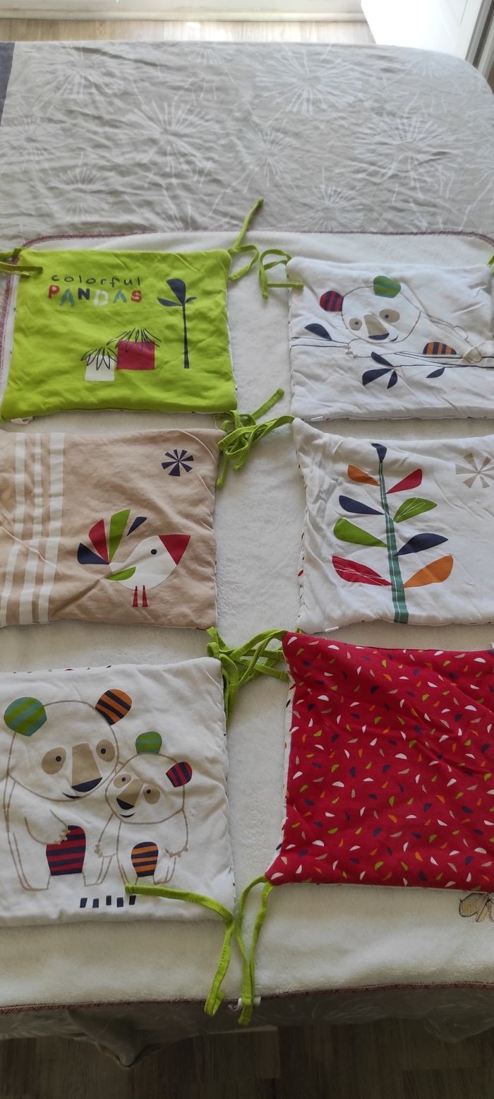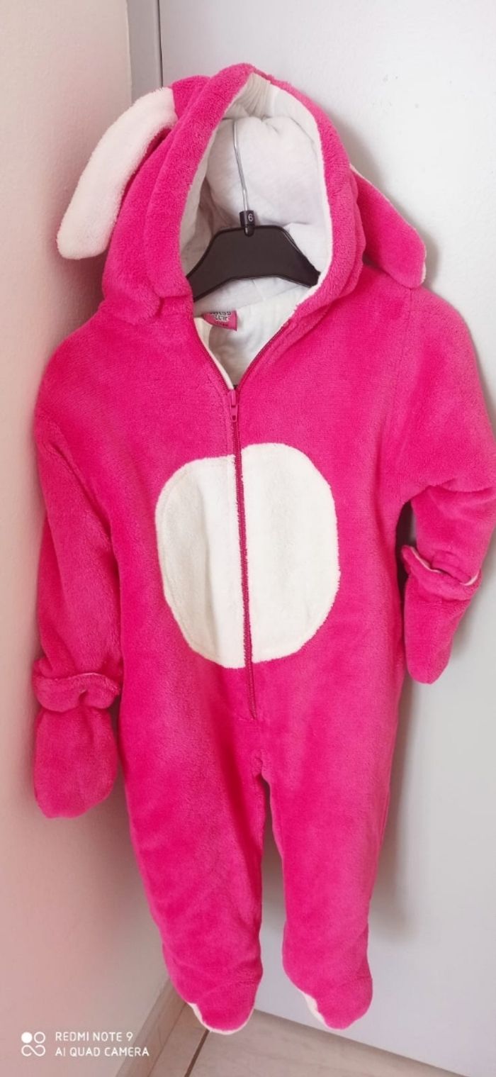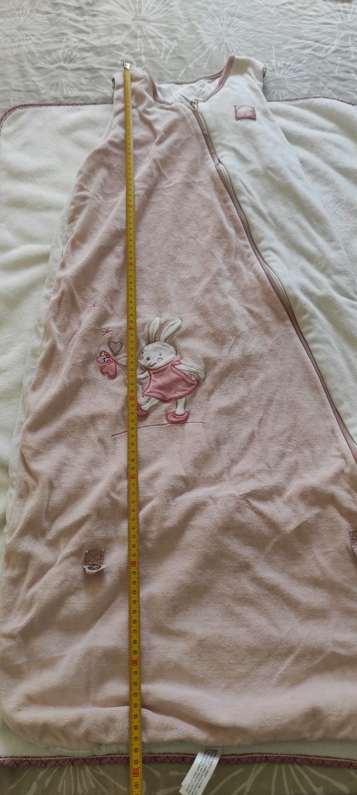 .1 surpyjama : combi rose et blanche toute douce toute chaude, oreilles de lapin sur la tête, fermeture éclaire sur le devant. 12 / 18 mois. Très bon état général .1 Tour de lit respirant ( ou tour de parc) à accrocher aux barreaux : 6 carrés dans les tons vert marron beige. Thème pandas. Bon état général (il manque juste une ficelle sur un des carrés voir dernière photo) . 1 gigoteuse rose et blanche 98cm, motif lapin marque moulin roty. évolutive : passe de 80cm à 100cm (se réduit avec des boutons pressions). Mi-saison (je ne trouve pas le TOG). Bon état général . 2 plaids : blanc pomette motif lune et un rouge uni en très bon état