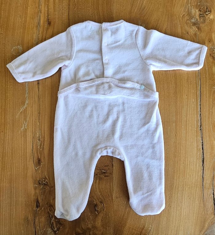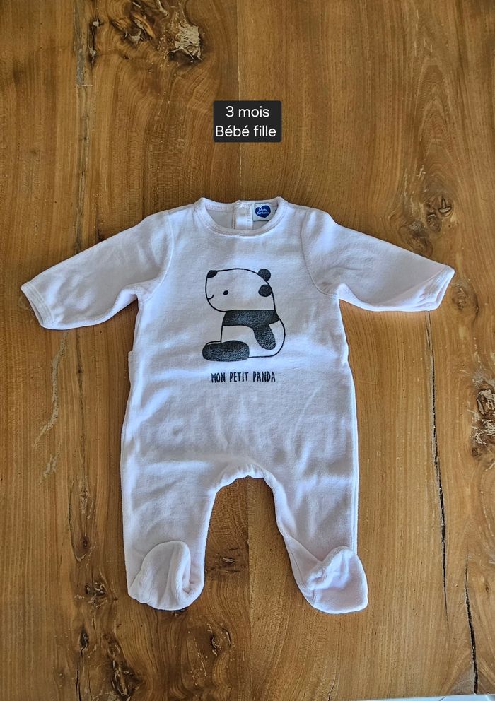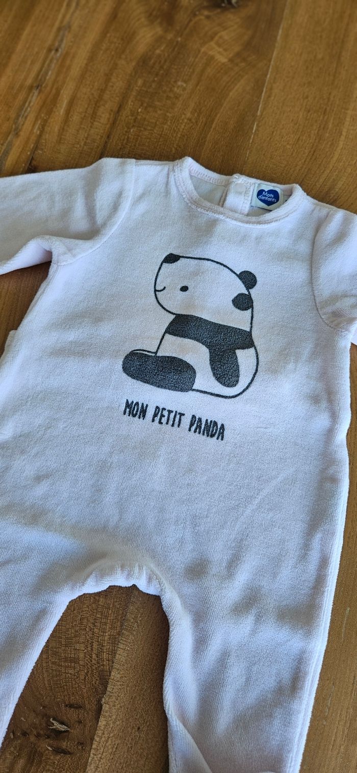 Pyjama rose clair bébé fille. Dessin d'un panda noir brodé sur le devant. Ouverture pressionnée dans le dos. Porté mais reste en très bon état. Aucune tâche, ni trou 👌