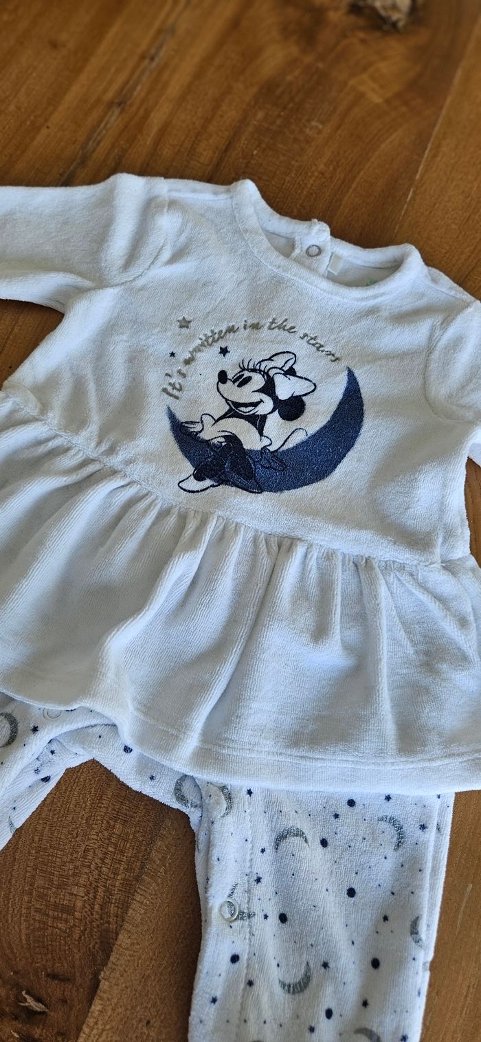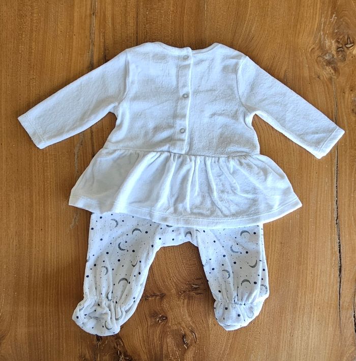 Pyjama chaud 1 pièce bébé fille, blanc. Motifs brodés sur le devant et le pantalon bleu marine et argenté. Ouverture pressionnée dans le dos et à l'entrejambe. Porté mais reste en très bon état. Aucune tâche, ni trou 👌