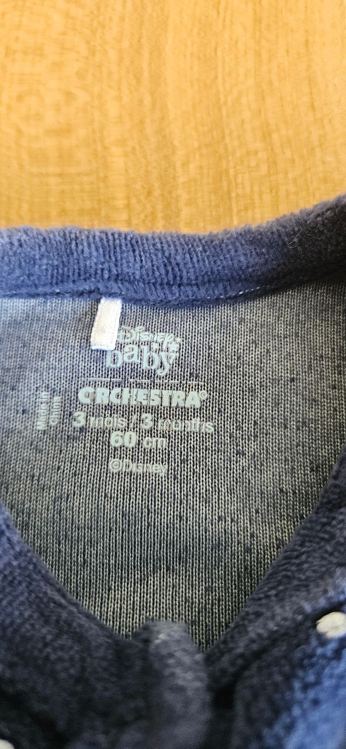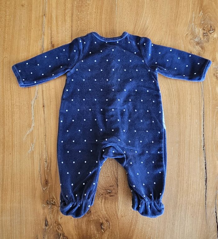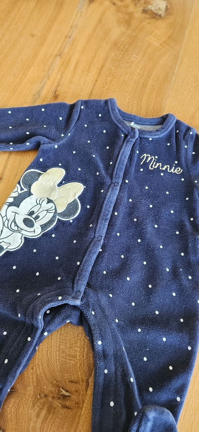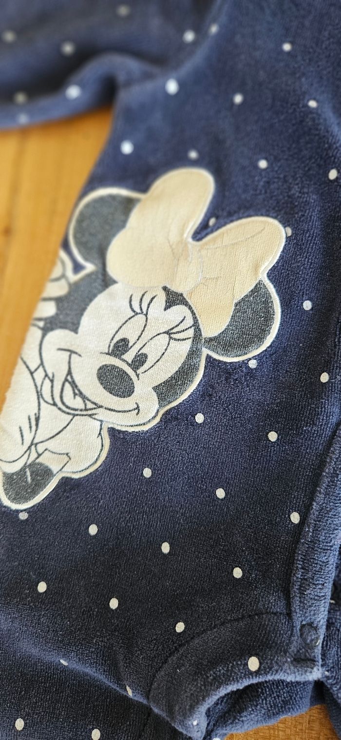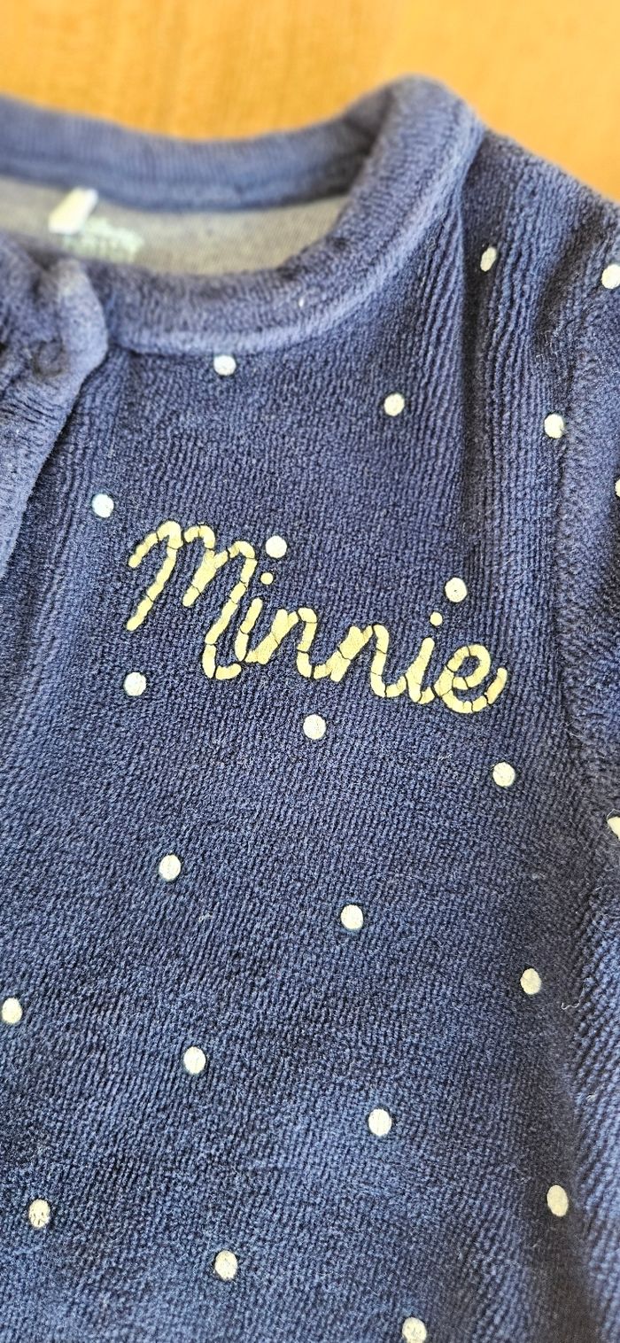 Pyjama chaud bébé fille bleu marine. Dessin et écriture Minnie brodé sur le devant. Points blancs imprimés sur l'ensemble du pyjama. Ouverture pressionnée sur le devant et à l'entrejambe. Porté mais reste en bon état. Aucune tâche, ni trou 👌
