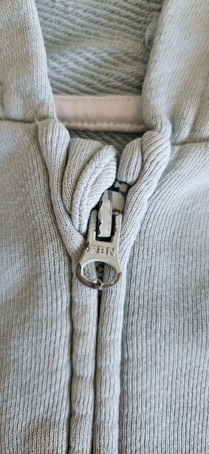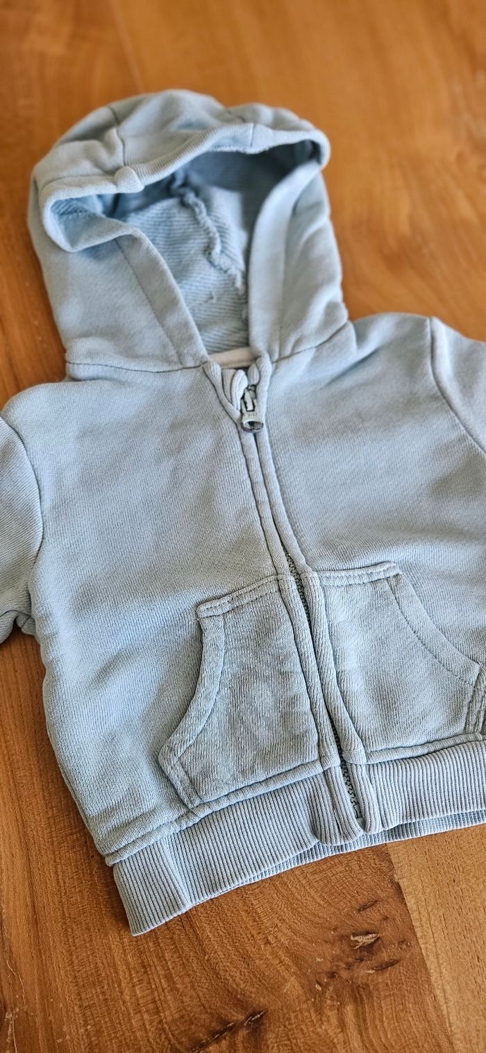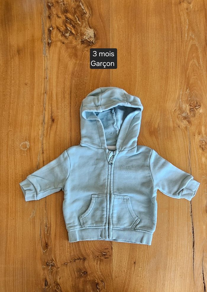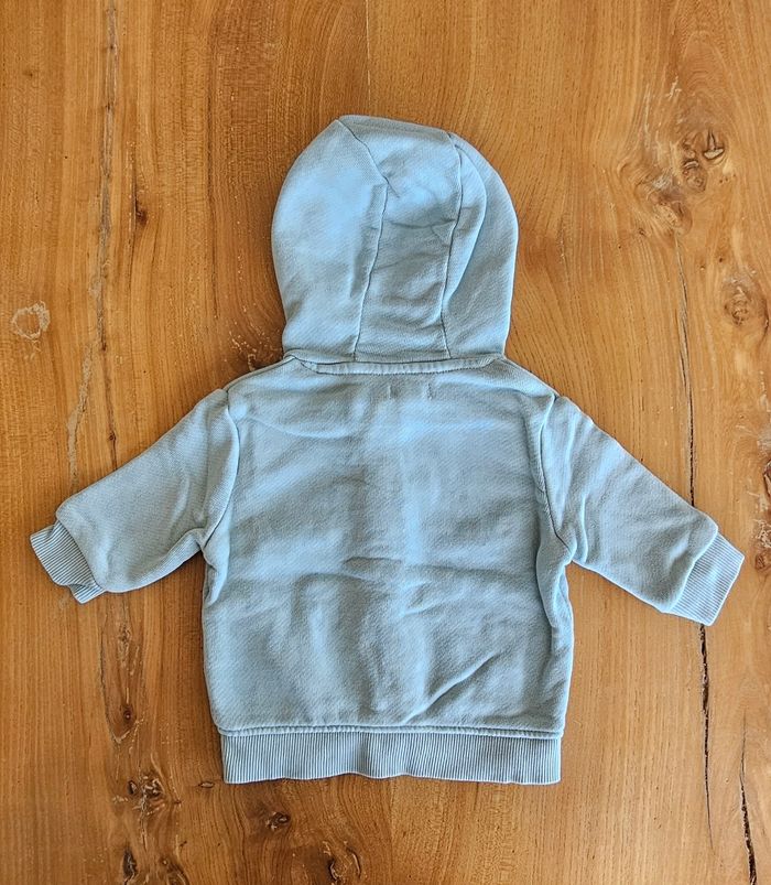 Veste légère bleu ciel bébé garçon avec capuche. Ouverture zippée sur le devant. Porté mais reste en très bon état (sauf la peinture de la fermeture éclair qui s'enlève, voir photo). Aucune tâche, ni trou 👌